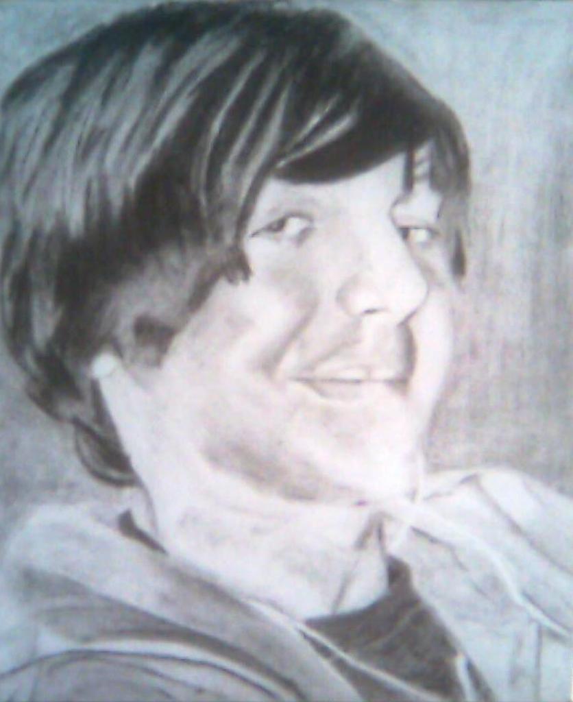 een portret geschetst met potlood getekend met houtskool en afgewerkt met arcylverf. deze keer zonder een dikke boord,klant is koning.