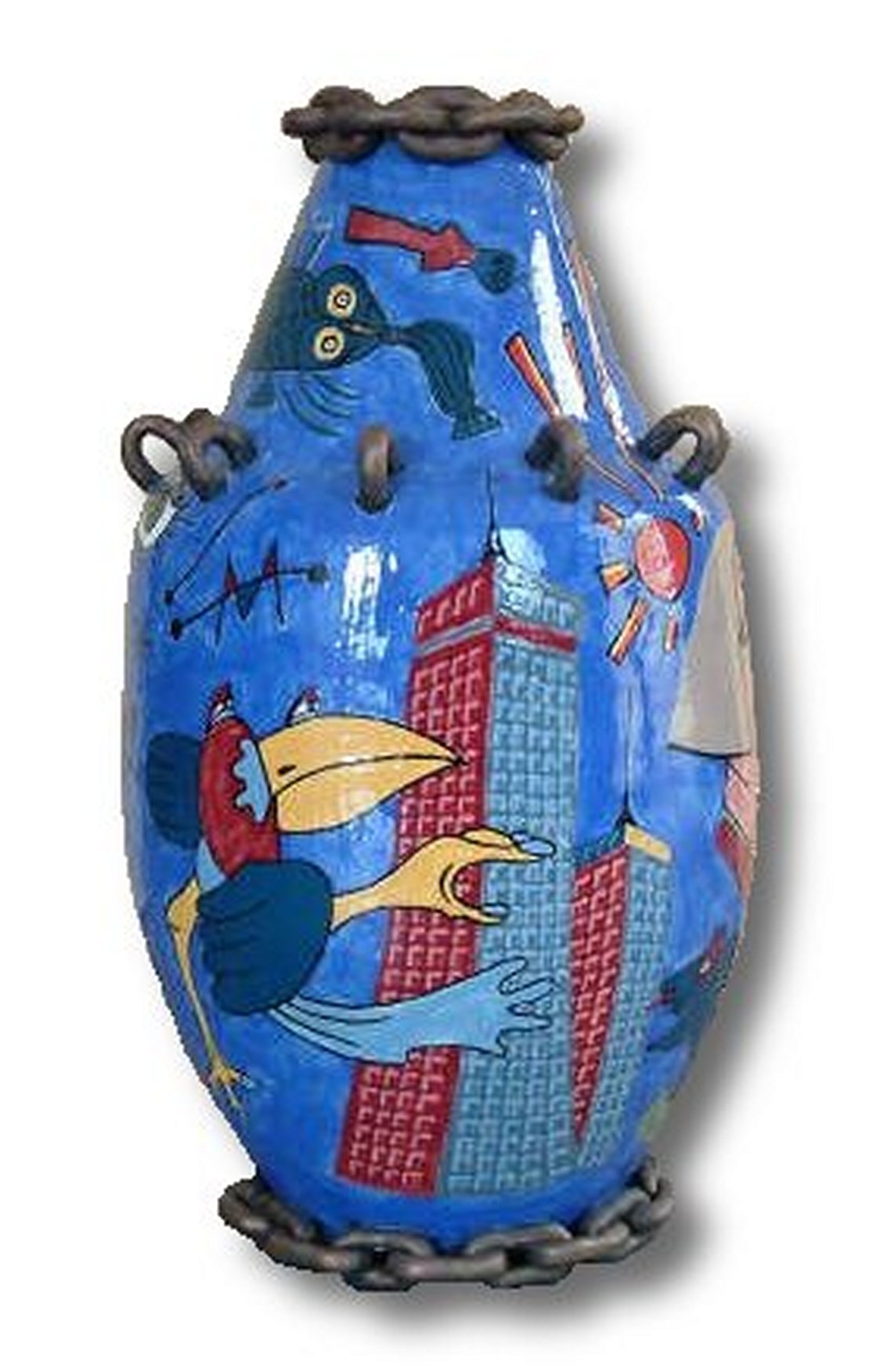 Op deze vaas zijn werken van Corneille, Picasso, Miro en Brood verwerkt. Aan de rand zijn schakels gezet om een ijzeren ketting te suggereren, die de verbondeheid symbolisert.