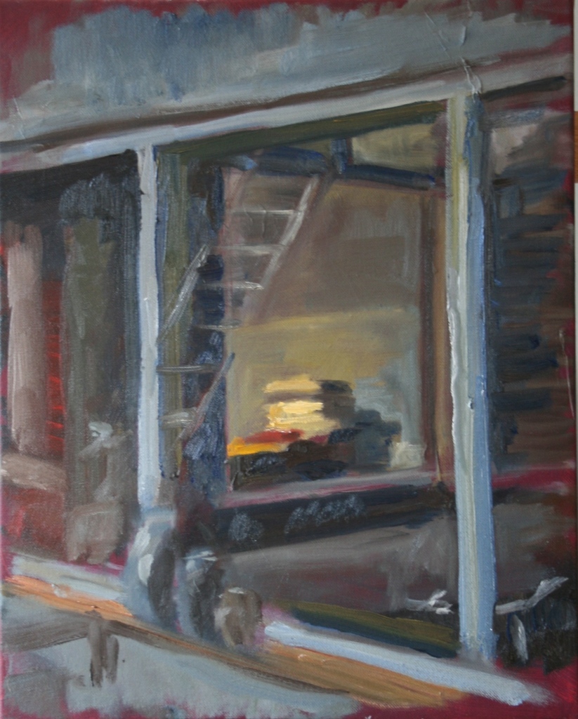 doorkijkje s'avonds , stapel boeken op keukentafel plein air geschilderd