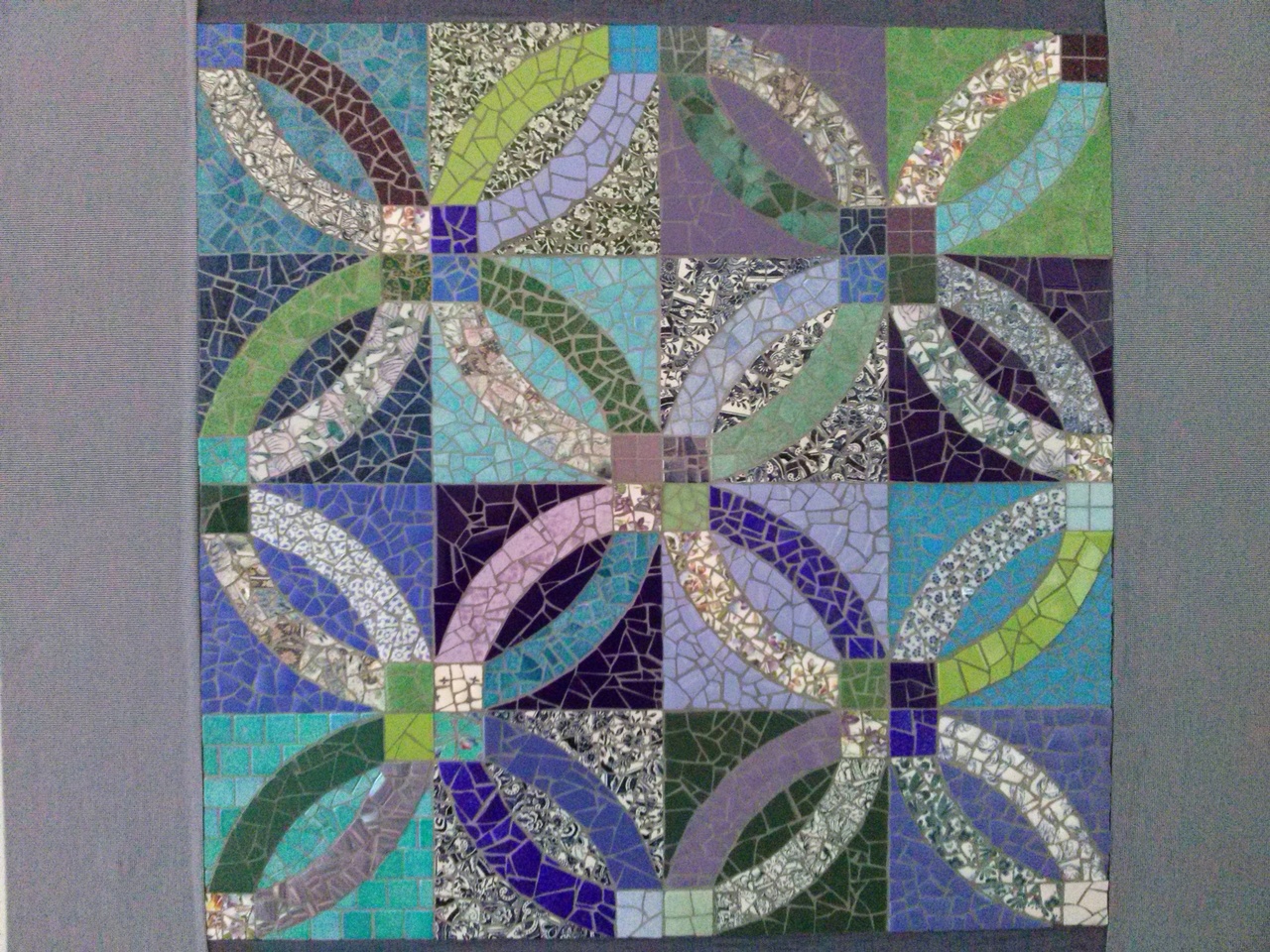 Ik wilde graag een patchworkmotief uitvoeren in mozaïek. Dit werk heb ik gemaakt in een periode dat ik ernstig ziek was. Het heeft me geholpen door zware behandelingen heen te komen. Het patroon heet weddingring, ik voeg daar zelf disconnected aan toe. De rand is met stof bekleed.