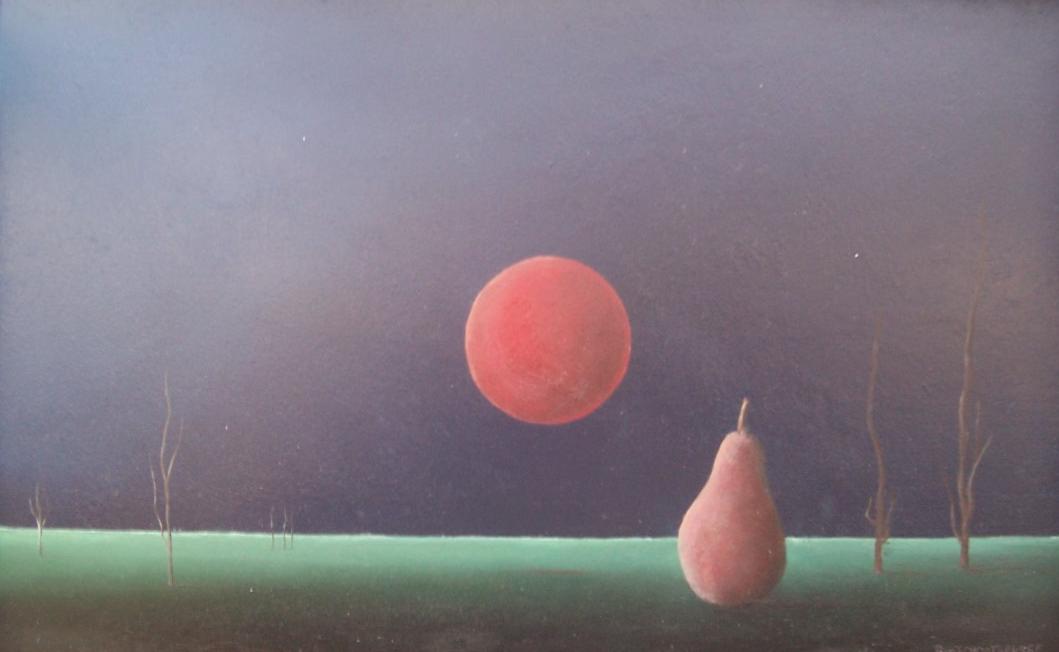 Een peer in een landschap waarin verhoudingen bevremend zijn onder een rode "maan".