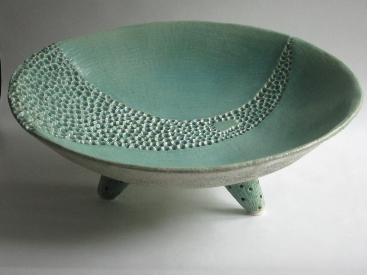 Handgevormd van witte chamotte klei en voorzien van eigen gemaakt glazuur