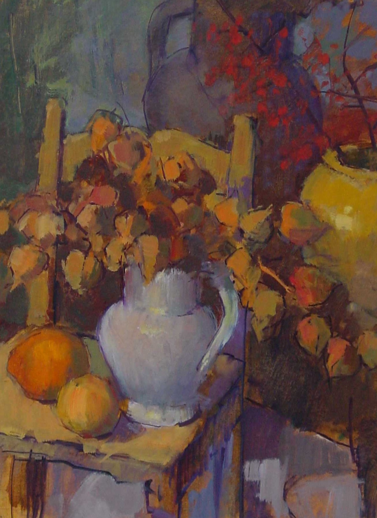 Stilleven met Spaans stoeltje waarop witte kruik met verdroogde lampionnen.