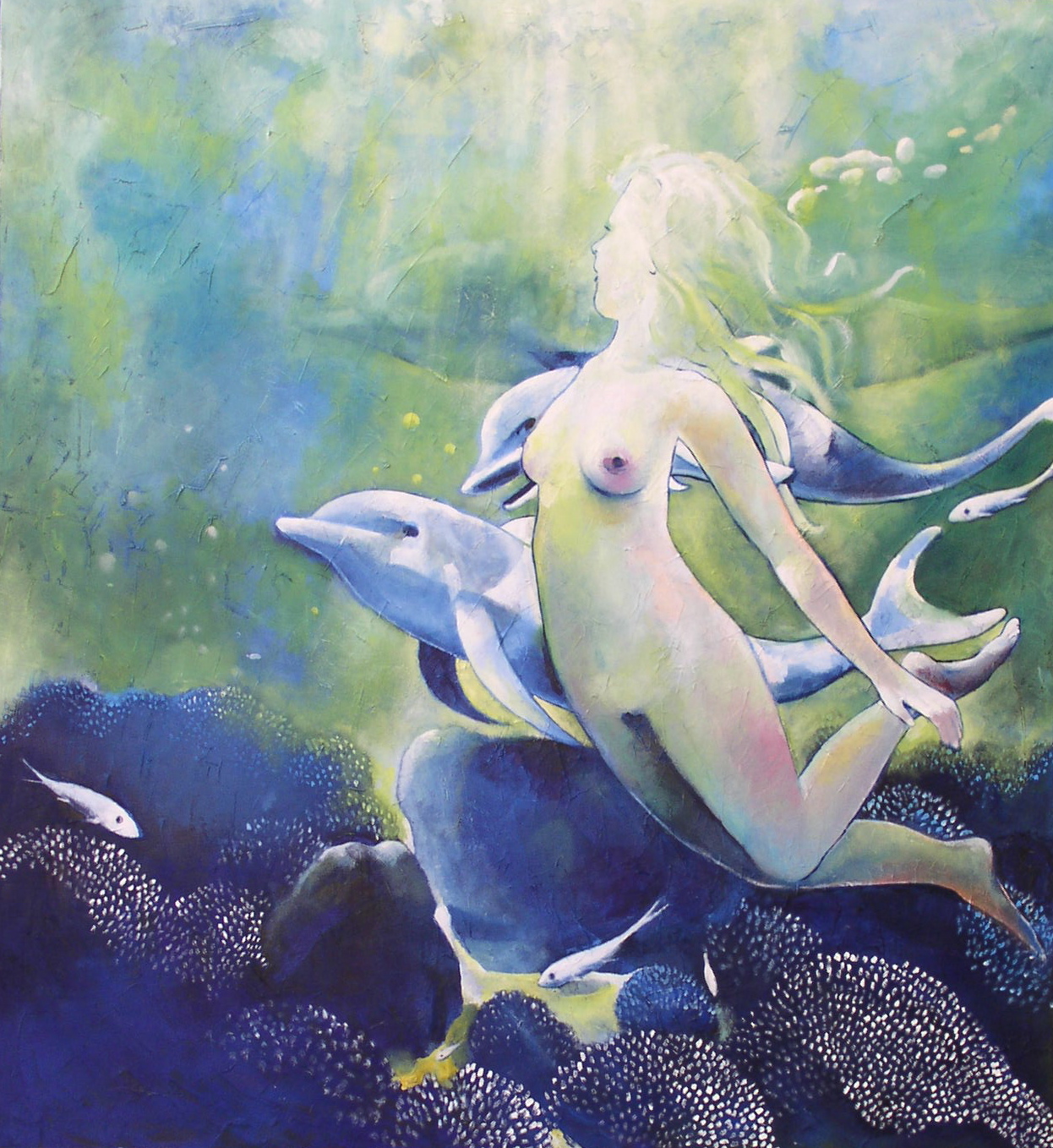 Wit Geel Blauw Paars Mystiek Spiritueel Groen Vrouw Water Liefde Dier Vissen Overgave Rivier Dolfijn Zwemmen Stroom Ontspanning Sereniteit