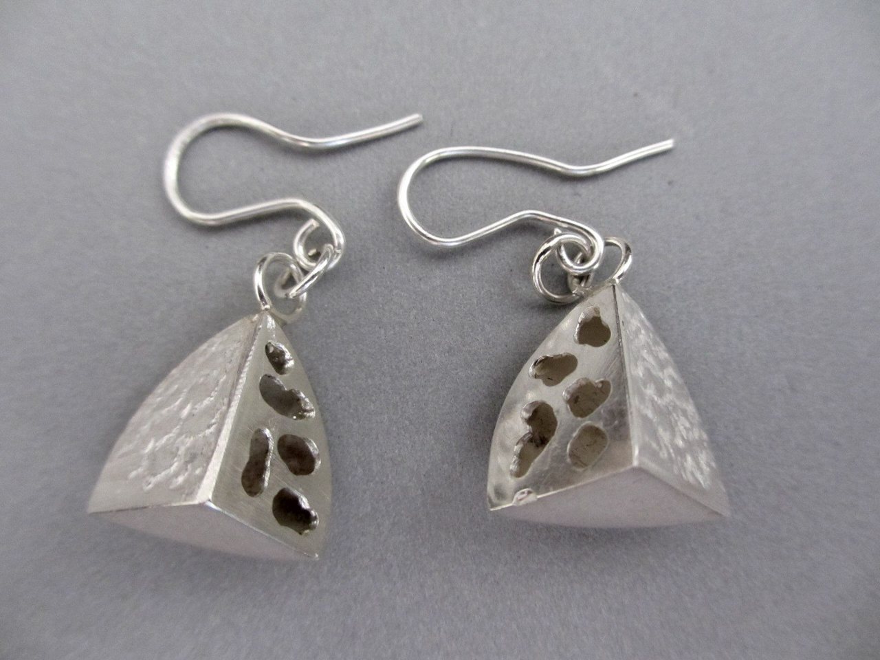 zilveren oorhangers, bestaande uit 4 aan elkaar gesoldeerde delen. gehamerd en uitgefreesd