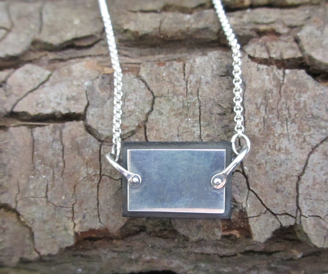 zilveren hanger. 2 zilveren plaatjes met een plaatje ebbenhout ertussen geklonken.
