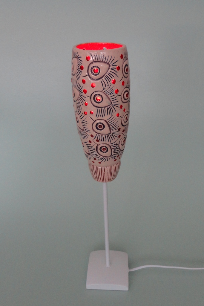 opengewerkte keramische lamp met pauwmotieven in relief op metalen voet