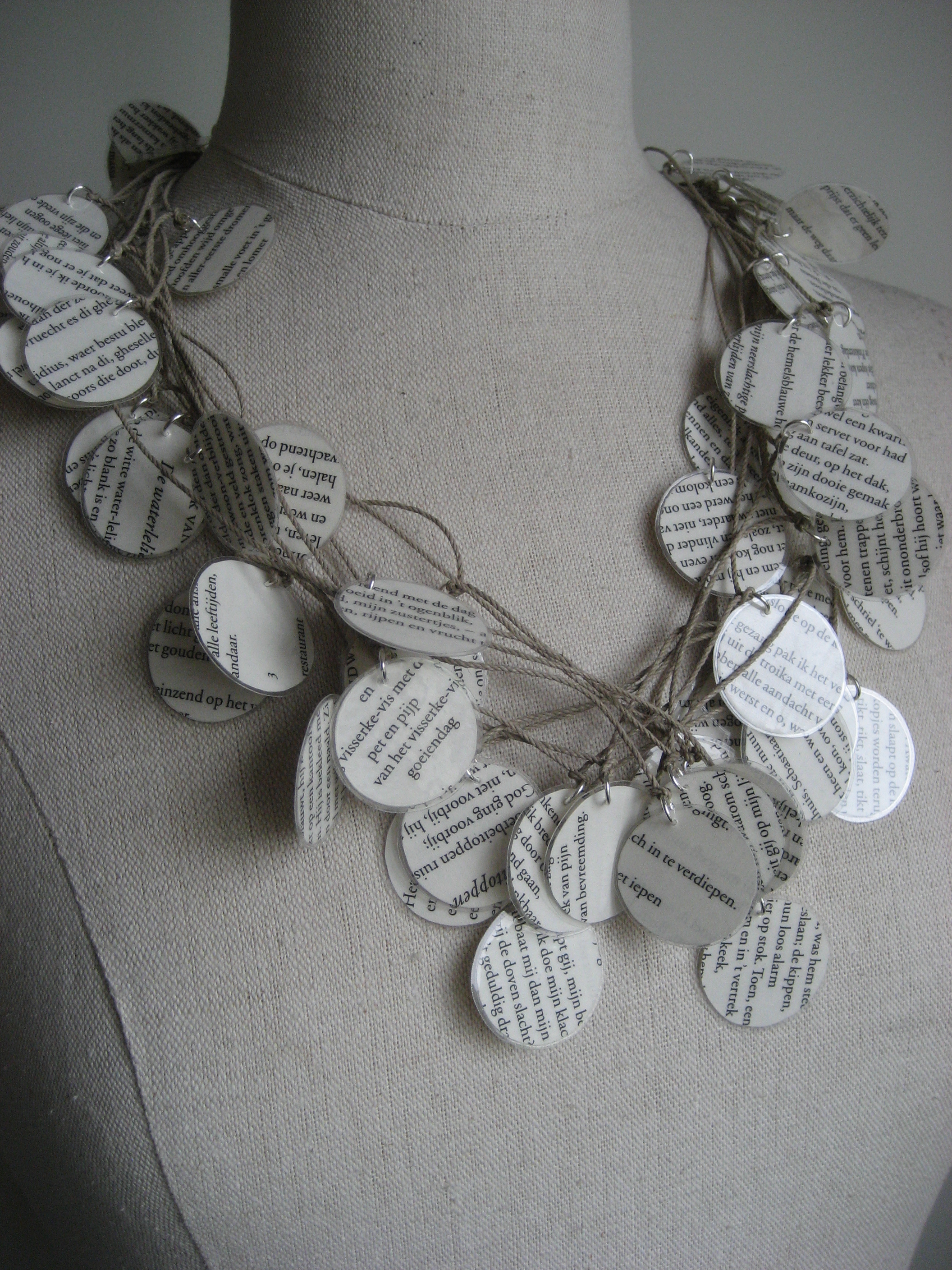 Een sieraad dat bestaat uit fragmenten Nederlandse en Vlaamse poëzie. De details zijn gelamineerd en aan elkaar bevestigd met vlasdraad