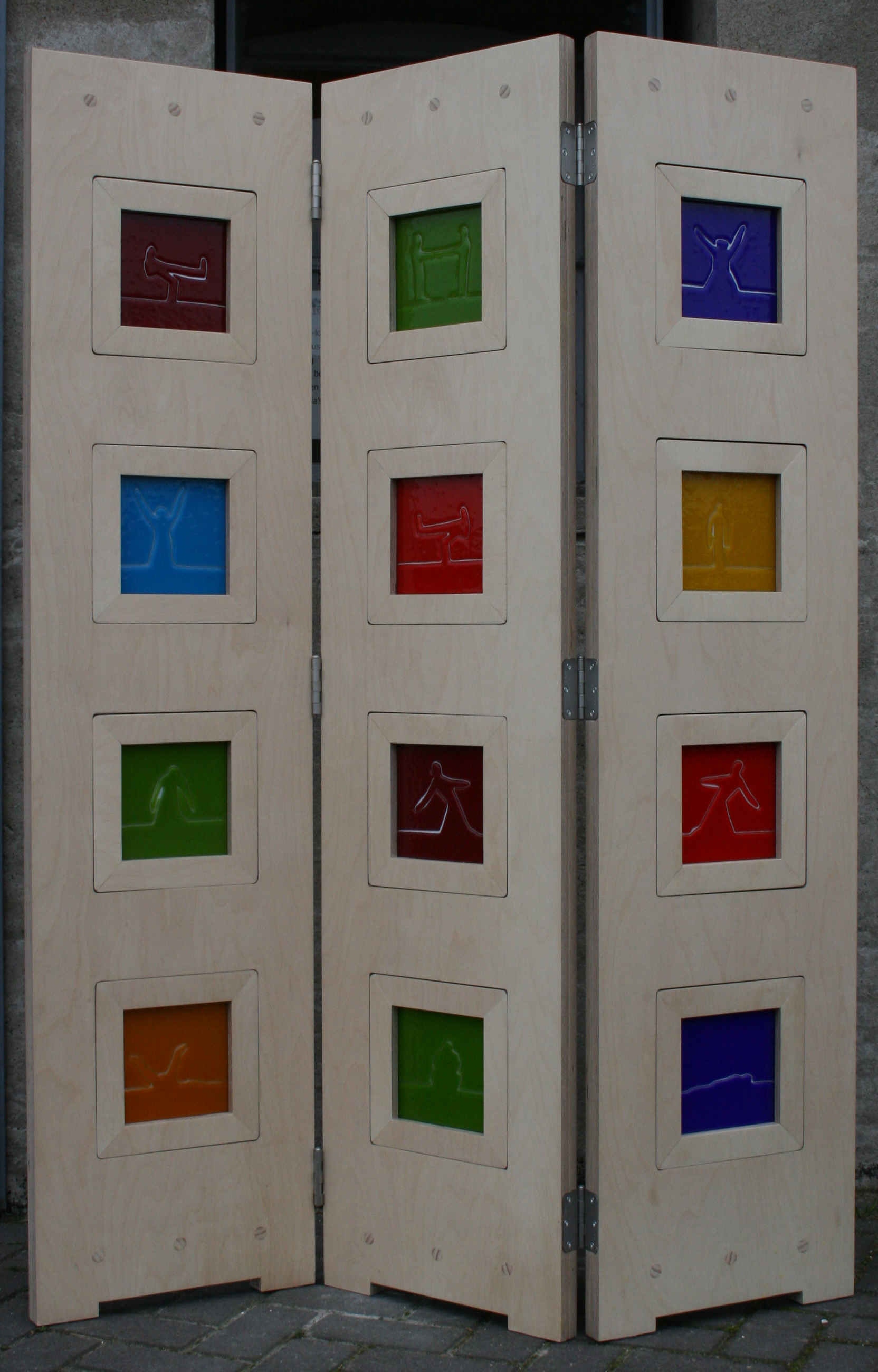 Kamerscherm in samenwerking met Ad van Houdt. Strak design, kleurig glaswerk. Beauty!