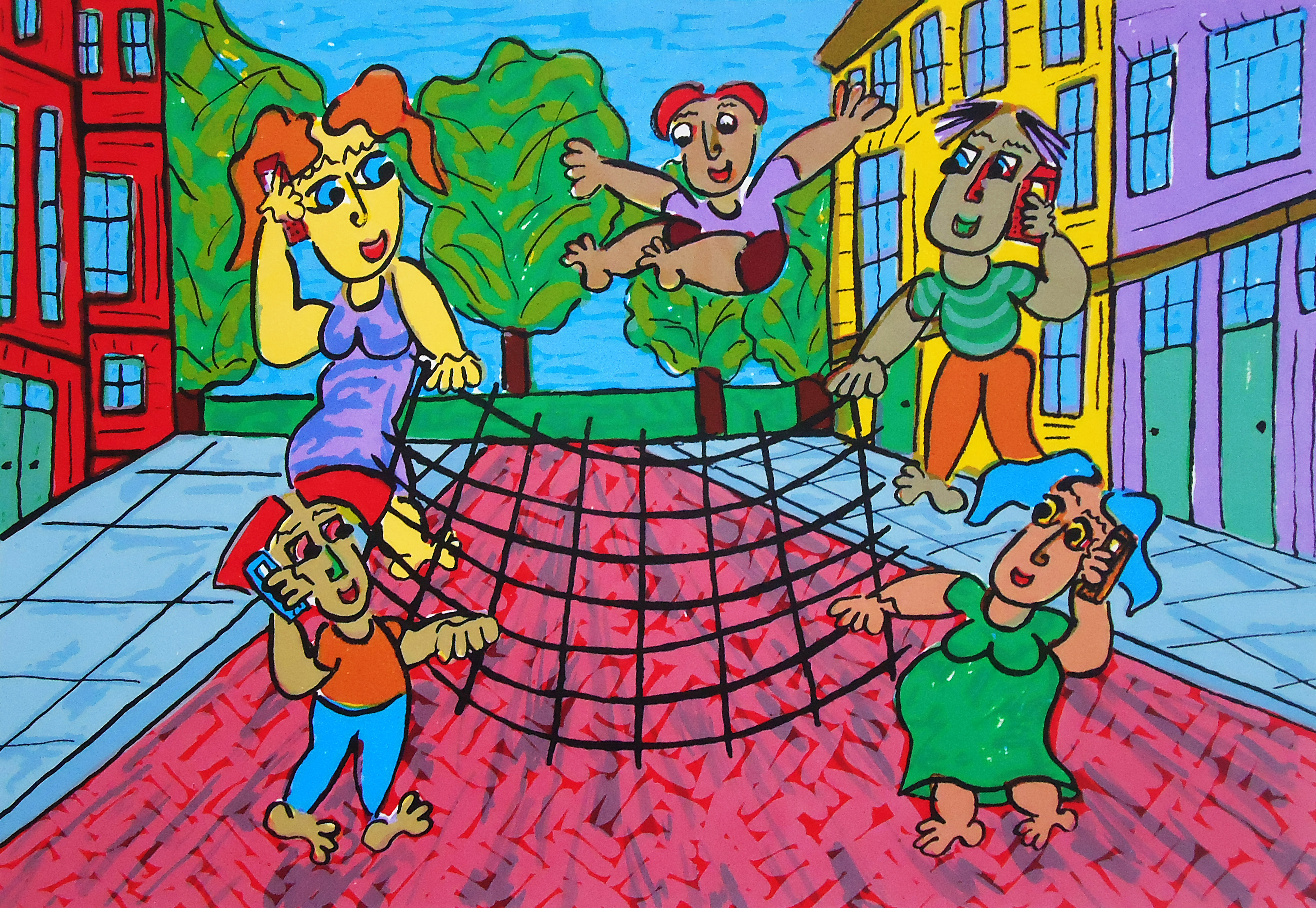 Zeefdruk Doe mee met Burgernet in opdracht van Burgernet, relatiegeschenk waarop de essentie van Burgernet gevisualiseerd wordt, oplage 100