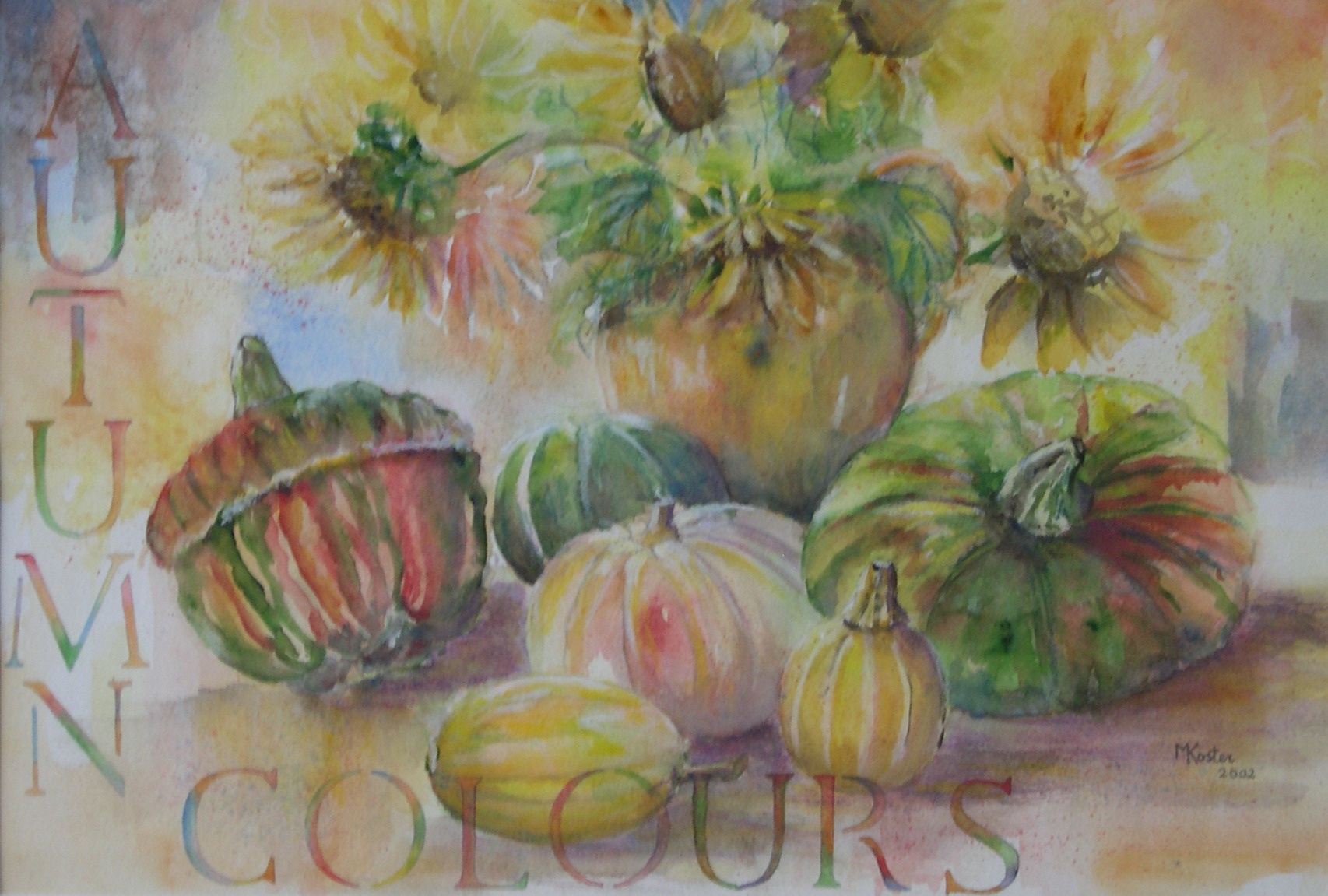 De herfstkleuren in kalebassen en pompoenen geven de echte herfstkleuren vorm. Ingelijst met passepartout en blankhouten wissellijst.