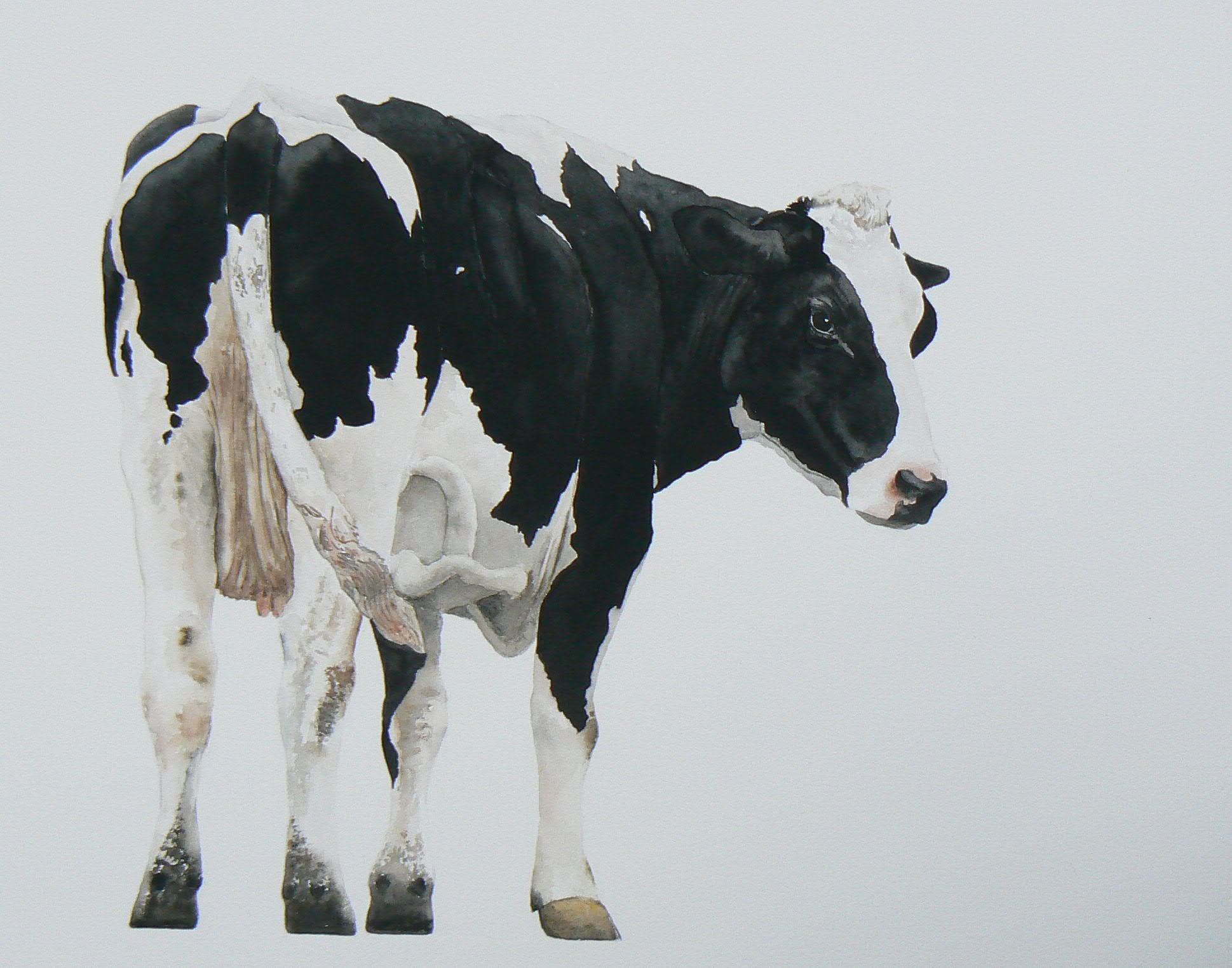 Een Hollandse Holsteiner kijkt achterom, nieuwsgierig? Alle prijzen van aquarellen zijn inclusief de lijst en passepartout.