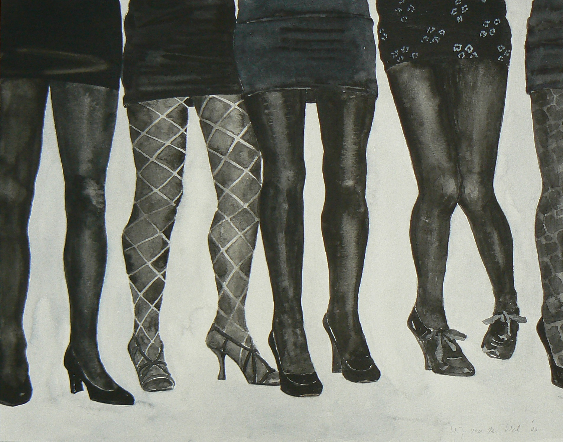 De dames staan te wachten tot ze gevraagd worden. De mooiste kousen en schoenen zullen dra de dansvloer betreden. In overwegend grijs- en zwarttinten is deze aquarel gemaakt, met een klein beetje blauw. Glans en stofuitdrukking zijn hier belangrijk