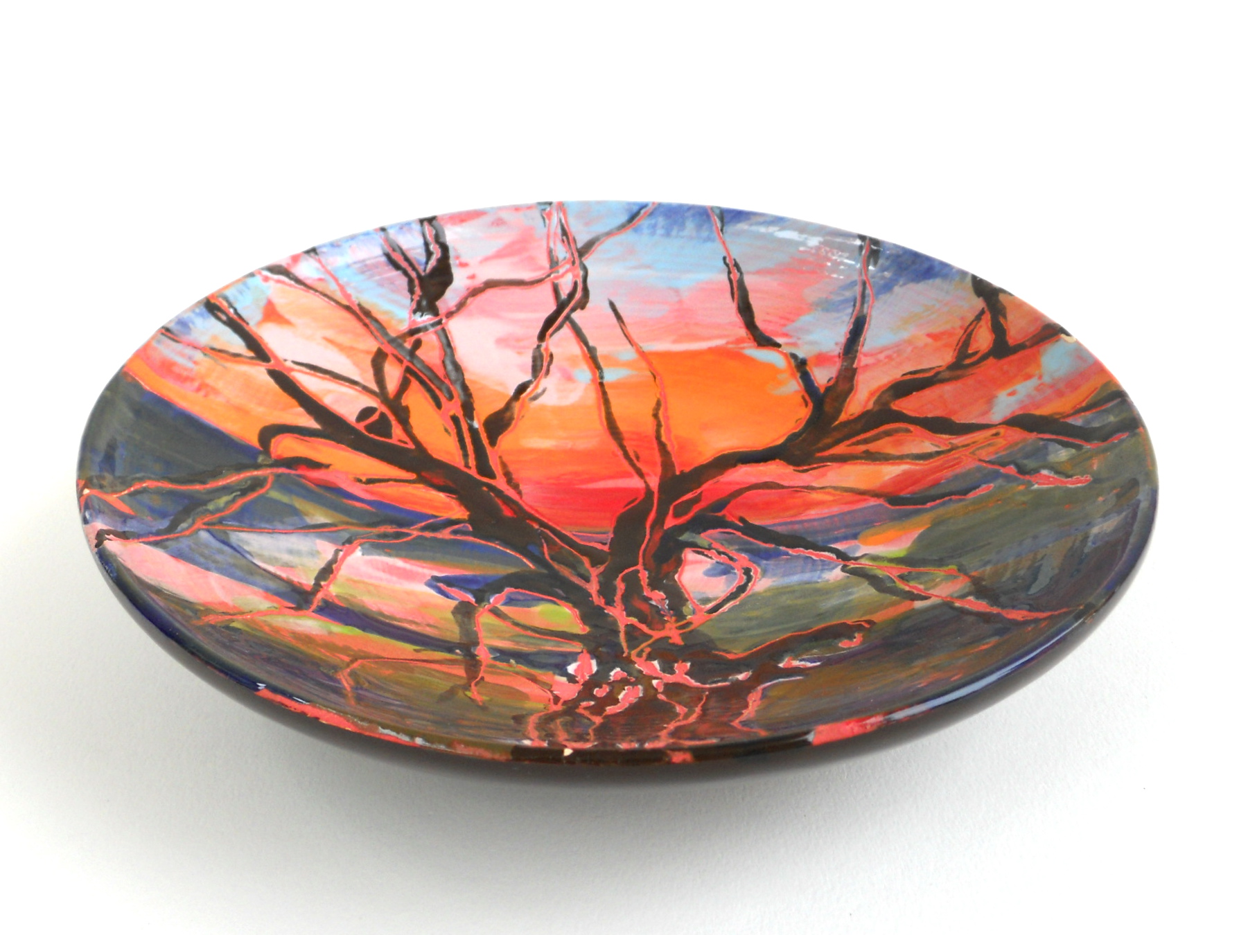 De ronde vorm van mijn keramiekschalen - die ik zelf draai - schept een ideale ruimte om bloemen, bomen en landschappen te verbeelden en in te sluiten. Zo kan ik tekenen, schilderen en ruimtelijk vormen met elkaar combineren.