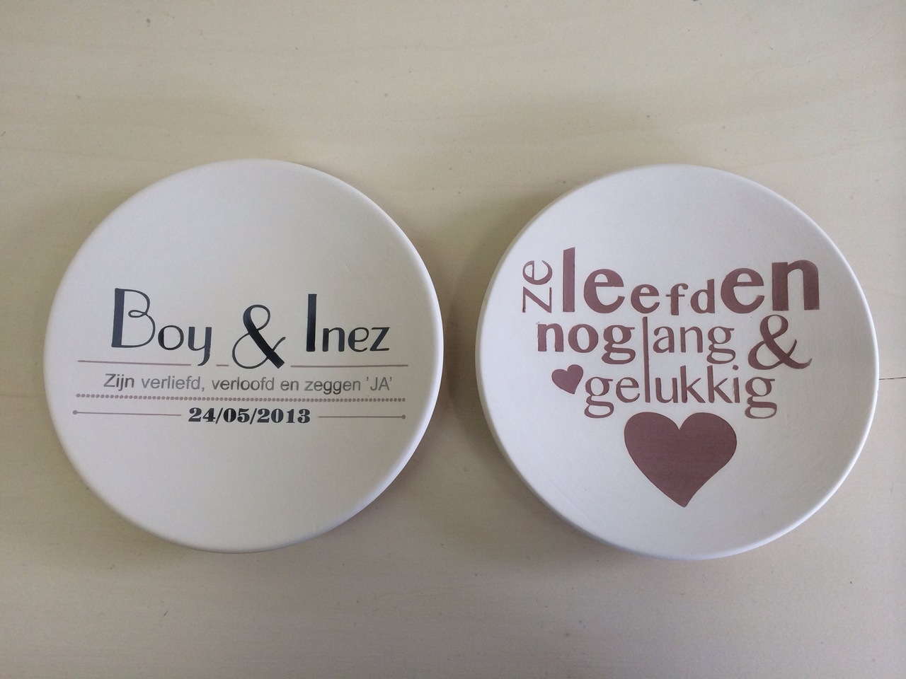 Bordje Bord Borden Gebaksbord Gebakbordje Servies Opdracht Geel Wit Letters Tekst Jubileum Bruiloft Trouwerij Oranje Rood Bruin Paars Blauw Zwart Groen Roze Vaas Beker Bekers