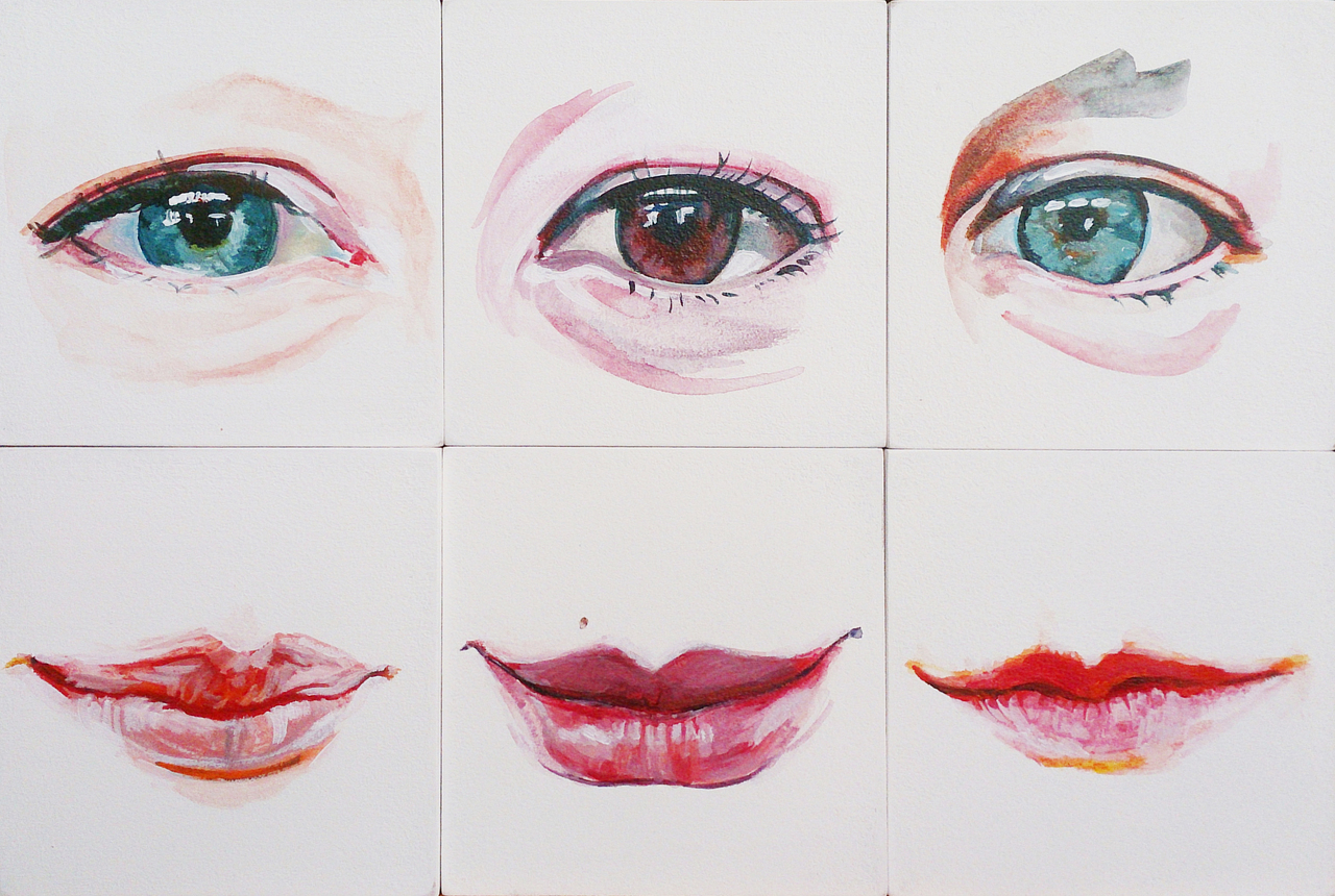 In opdracht vervaardigd. 6 paneeltjes beschilderd met 3 ogen en 3 monden