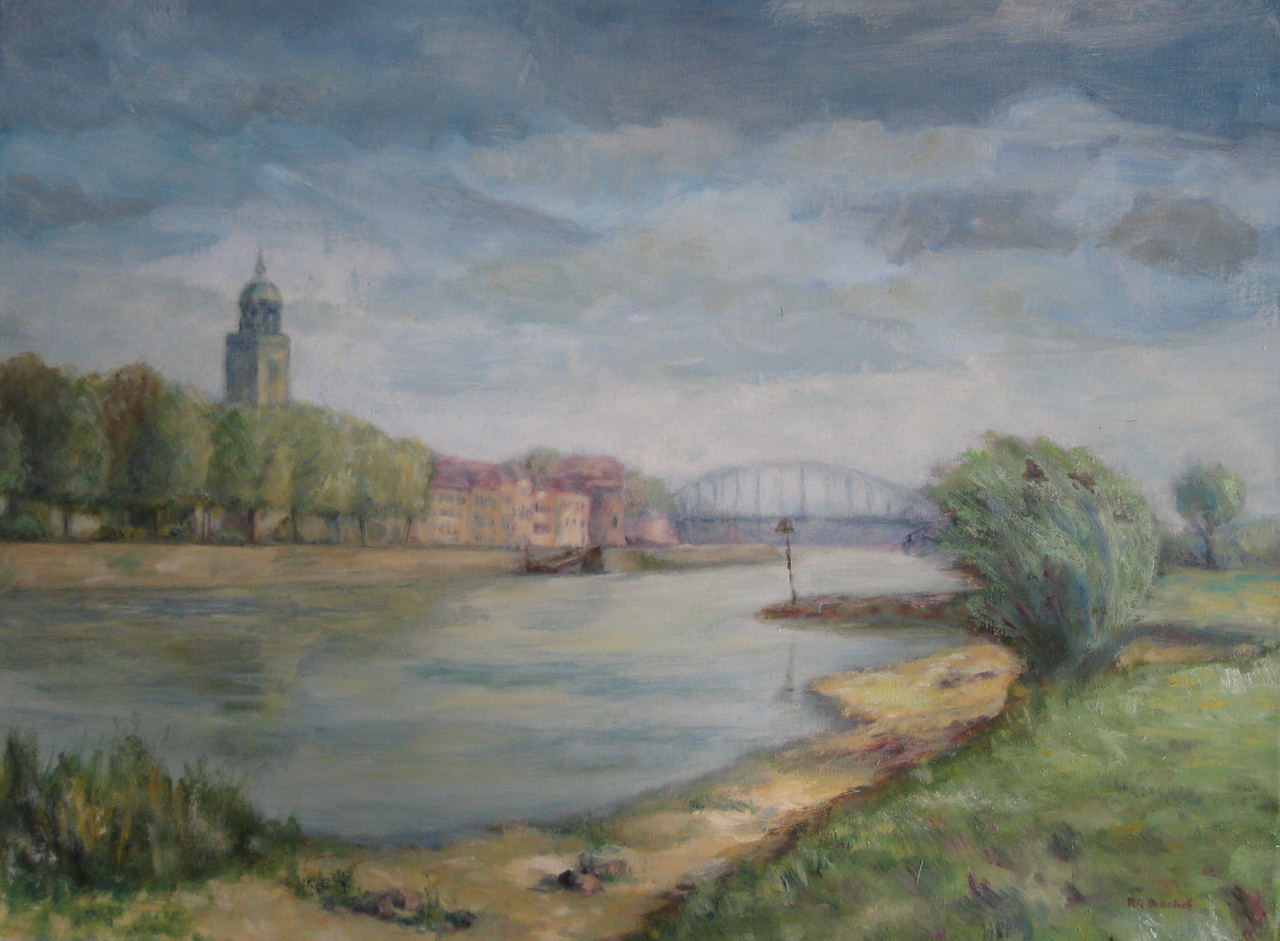 IJssel met het gezicht op Deventer vanaf de stadsweide geschilderd.