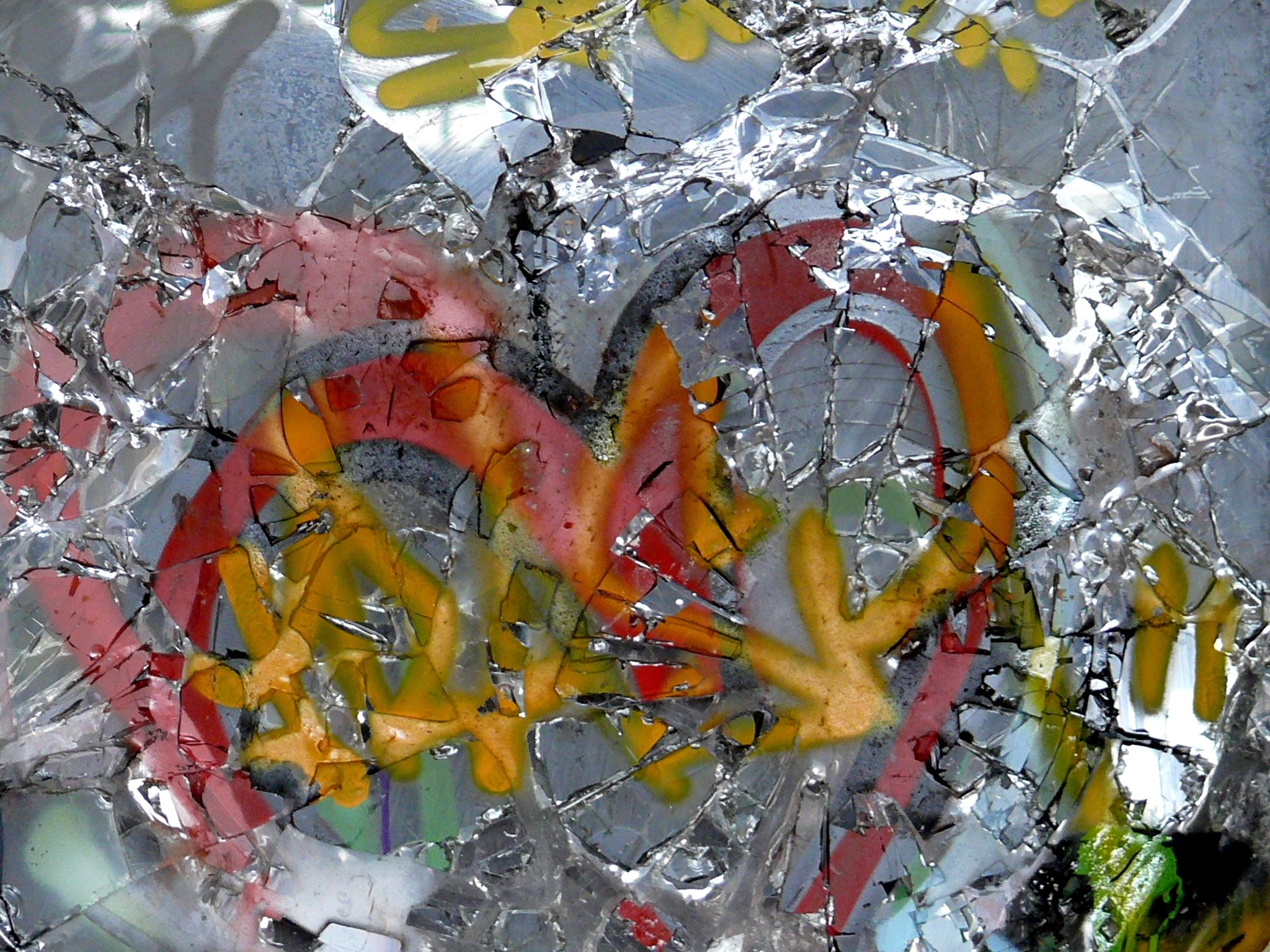 Foto van gebroken glas met graffiti in oude fabriek in Zutphen.