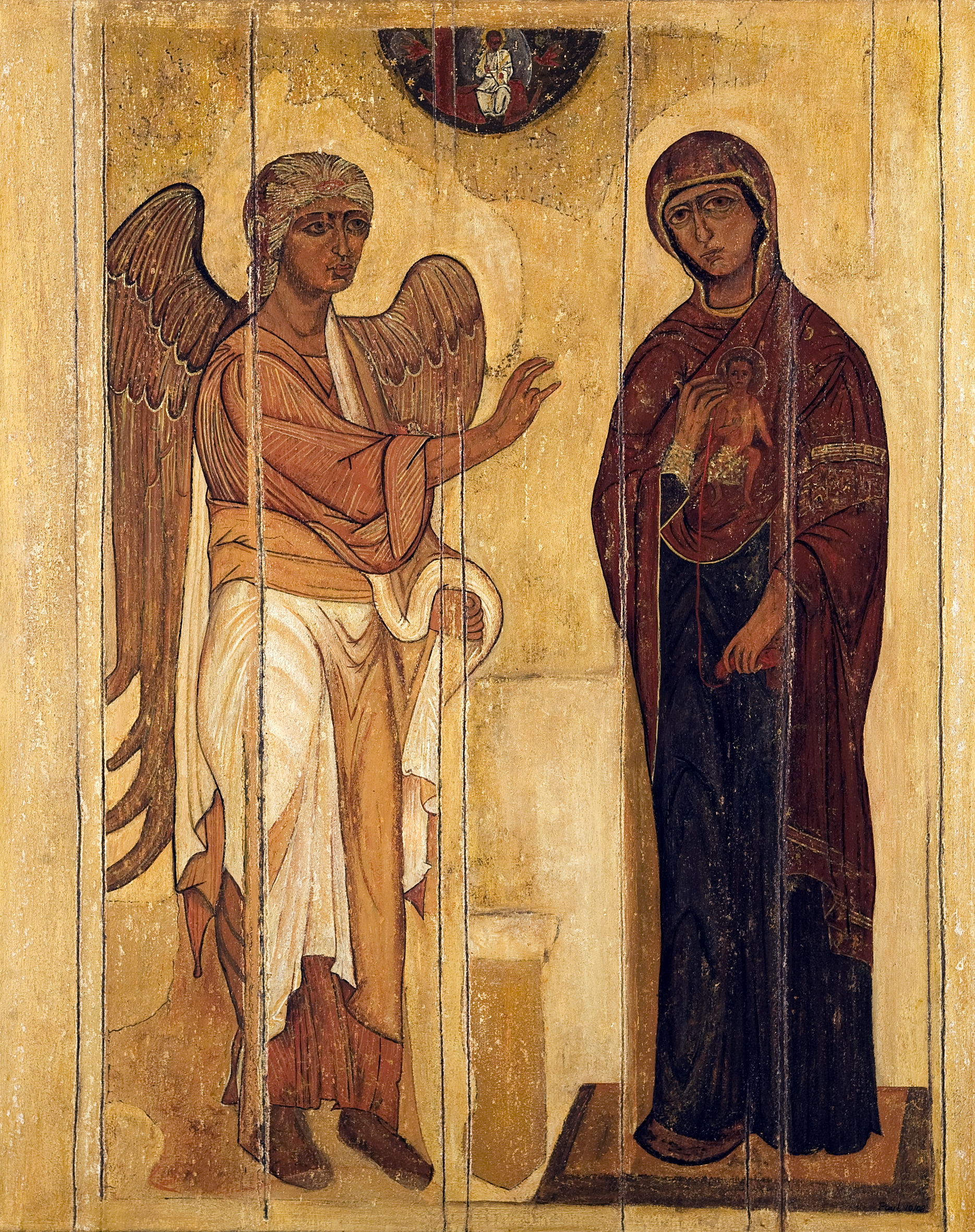 Moderne versie van een bestaand 12e eeuws Russische Ikoon met nadruk op de beschadiging en slijtage van eeuwen gebruik en misbruik.