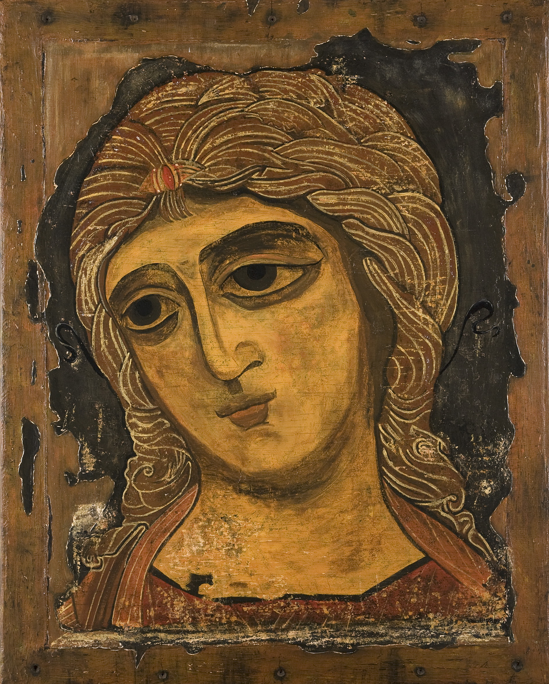 Moderne versie van een bestaand 13e eeuws Russisch Ikoon met nadruk op de slijtage en beschadigingen opgelopen door de eeuwen heen.