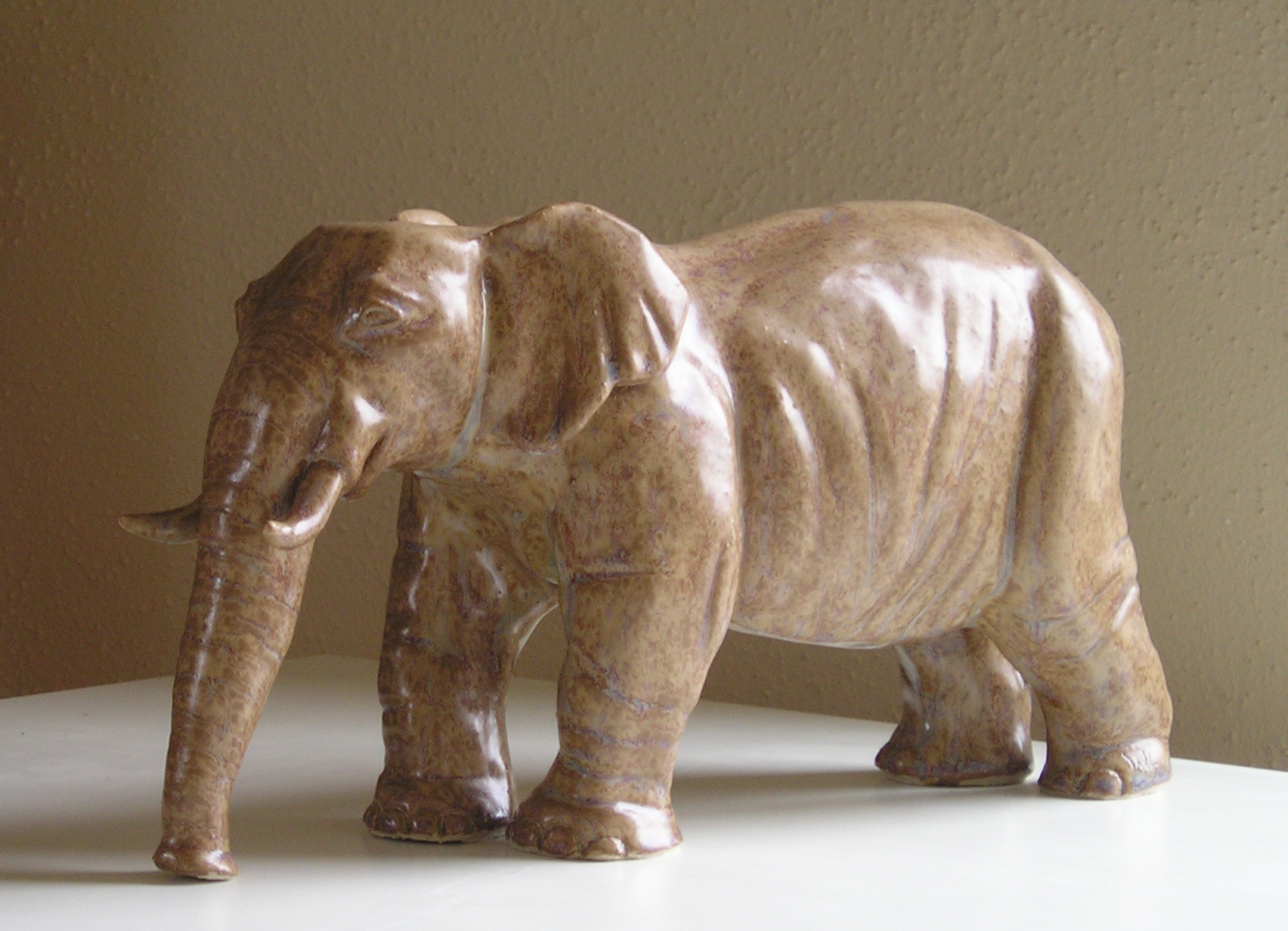 handgevormd beeld, klei, gestookt op 1220º(weerbestendig), geglazuurd bruin/beige zijdeglans