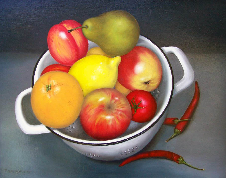 Wit Figuratief Grijs Modern Rood Oranje Groen Fruit Kleurrijk Realistisch Olieverf Peer Appel Ingelijst Tomaat Vergiet Donkergrijs Nectarine