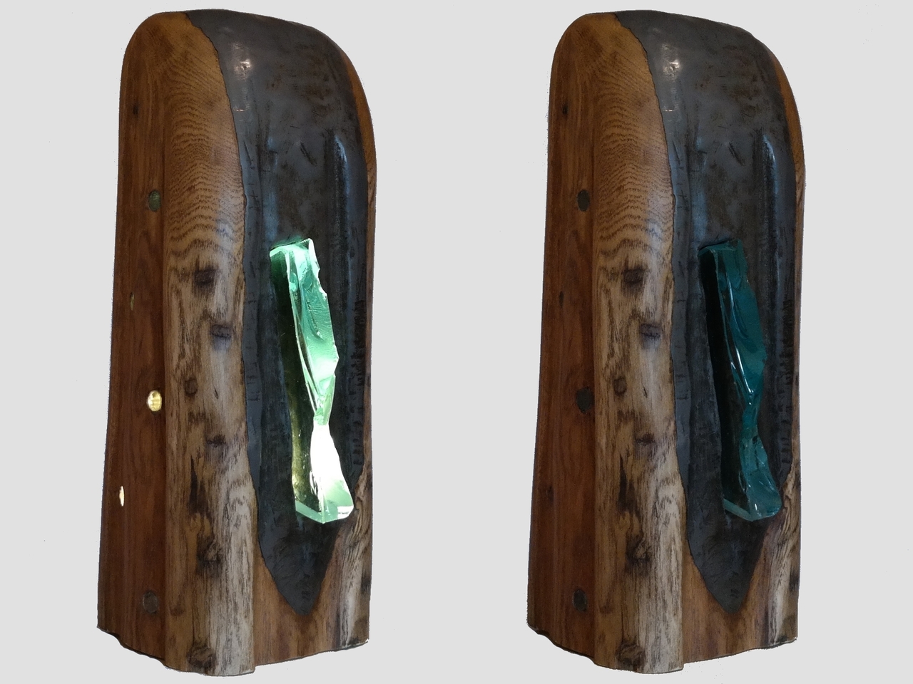 '...Inner Light...Shinning Out' is gemaakt van Inlands Eiken waarin zowel links als rechts 6 glasstaafjes zijn verwerkt van 10mm. Voorin is een dik stuk glas geplaatst. Het hout is bekleed met lood. Binnenin zit een led lampje.