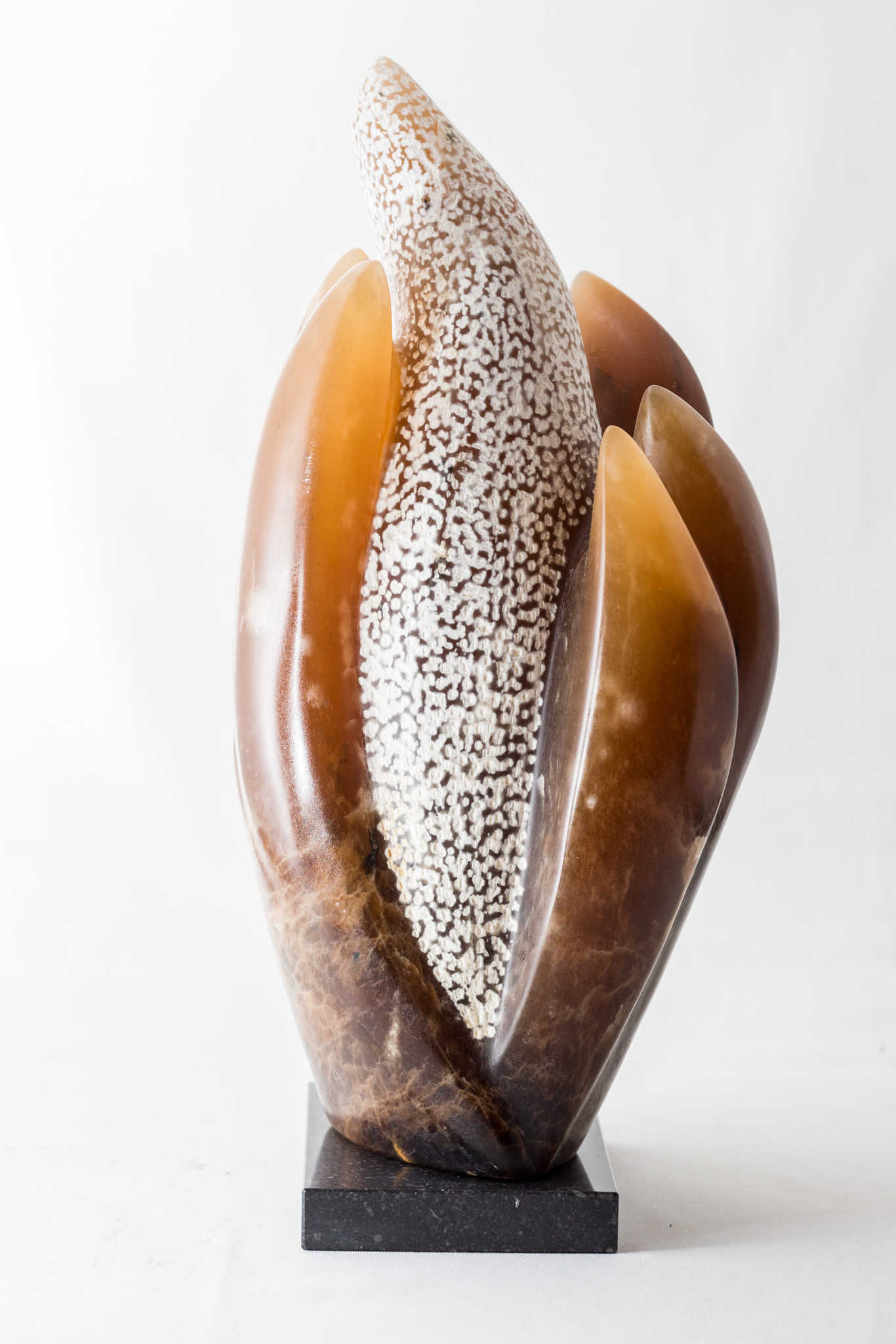 Abstract beeld van albast uit Spanje. Staande, opengewerkte vorm. Kleur bruin caramel, deels nabewerkt met beitel. Het beeld is geplaatst op een zwarte, hardstenen sokkel