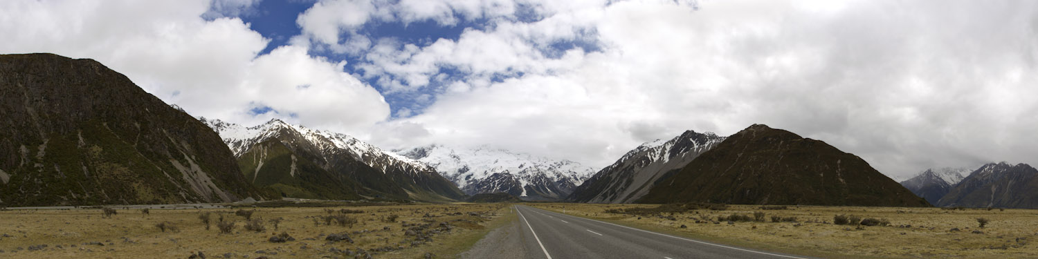 Panorama van Mount Cook, Nieuw Zeeland Oplage: 3 stuks Afdruk op fotopapier in zwarte lijst met gebroken witte passepartout Onderstaande maten zijn de afmetingen van de foto, niet de lijst. Deze foto is ook beschikbaar in andere maten tot maximaal 140x35cm (maten van foto, niet lijst)