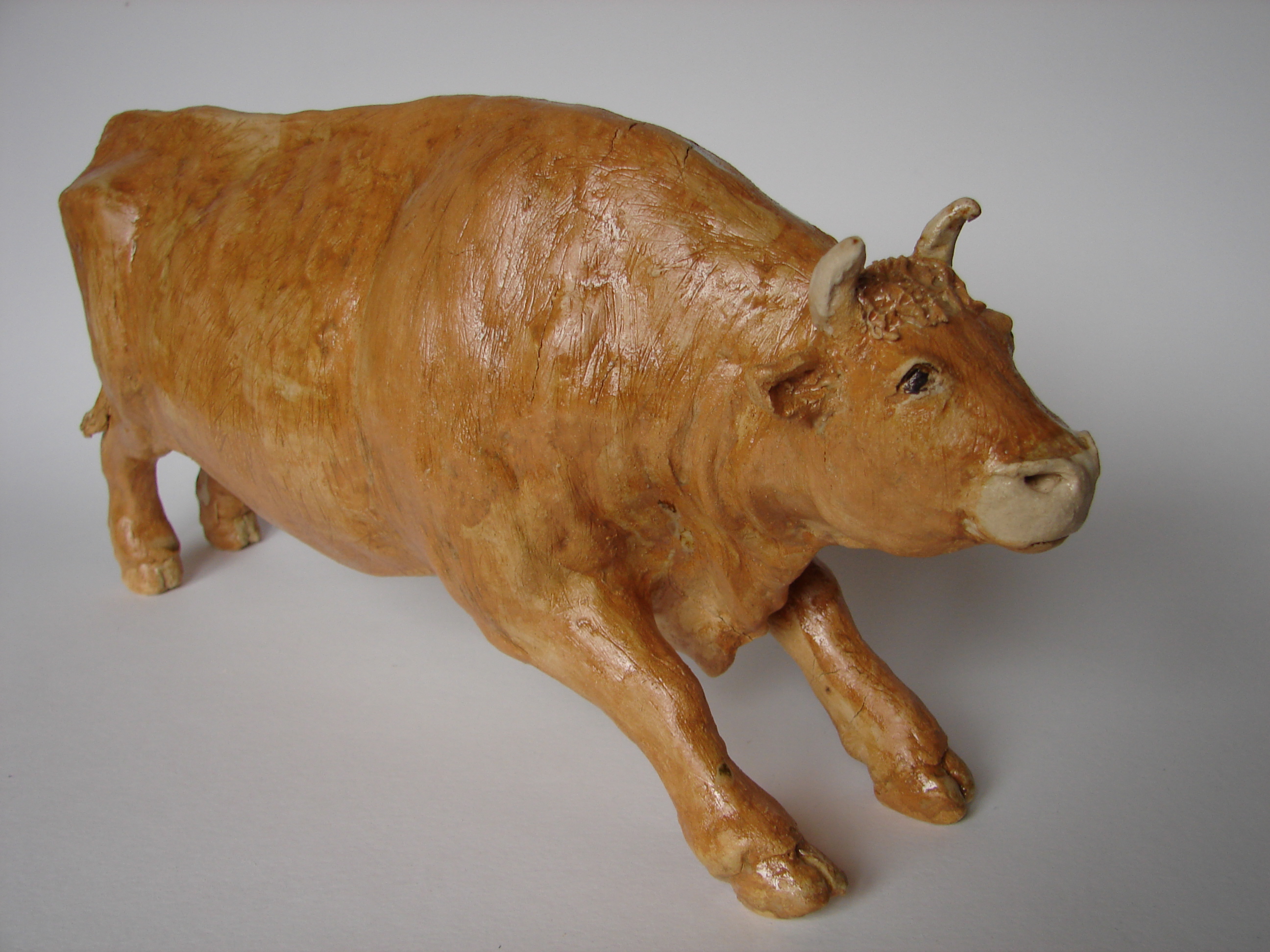Galopperende stier in steengoed/porseleinklei, handgevormd, geheel hol gebouwd.