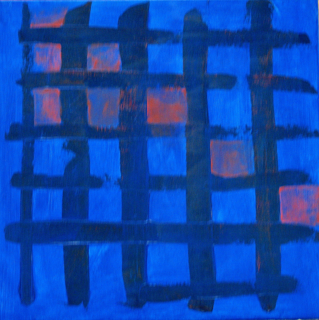 Blauw op blauw met hier en daar wat rood. Raster, rooster, red mij. Verdwaald in de nacht. De stad lonkt en stoot af, biedt houvast, maar waar klamp ik mij aan vast?