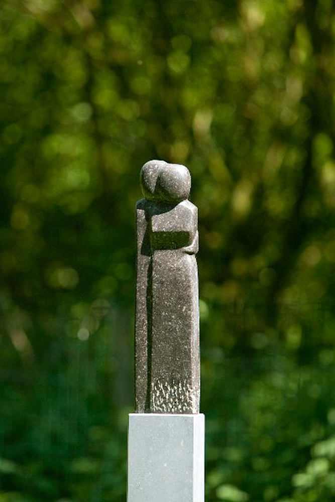 Buitenbeeld van hardsteen op hardstenen sokkel; totale hoogte 130 cm.
