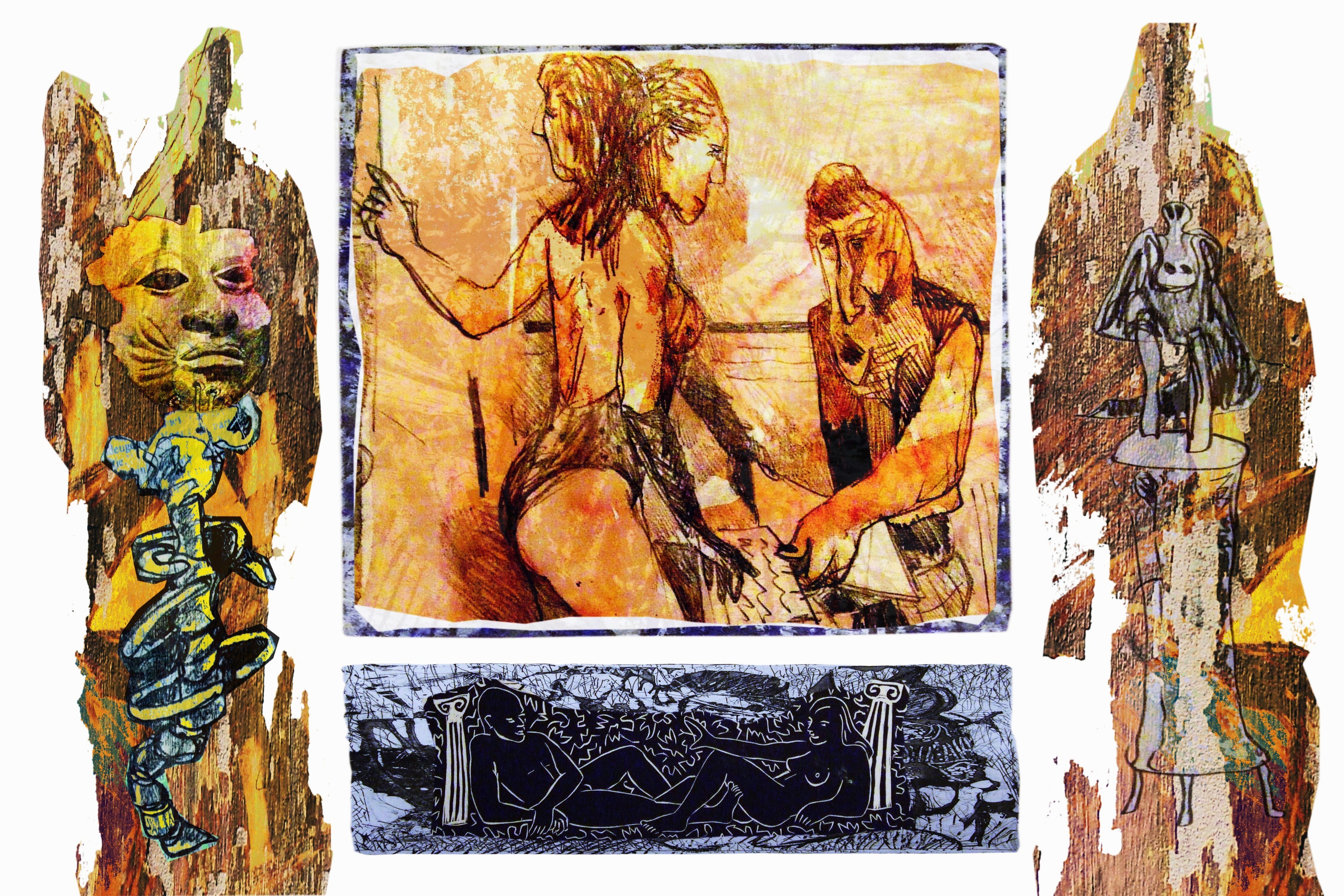 Digitale collage van fragmenten van tekeningen, schilderijen en grafiek gedrukt op 310 grs. Hahnemühle Fine Art papier. Andere formaten mogelijk