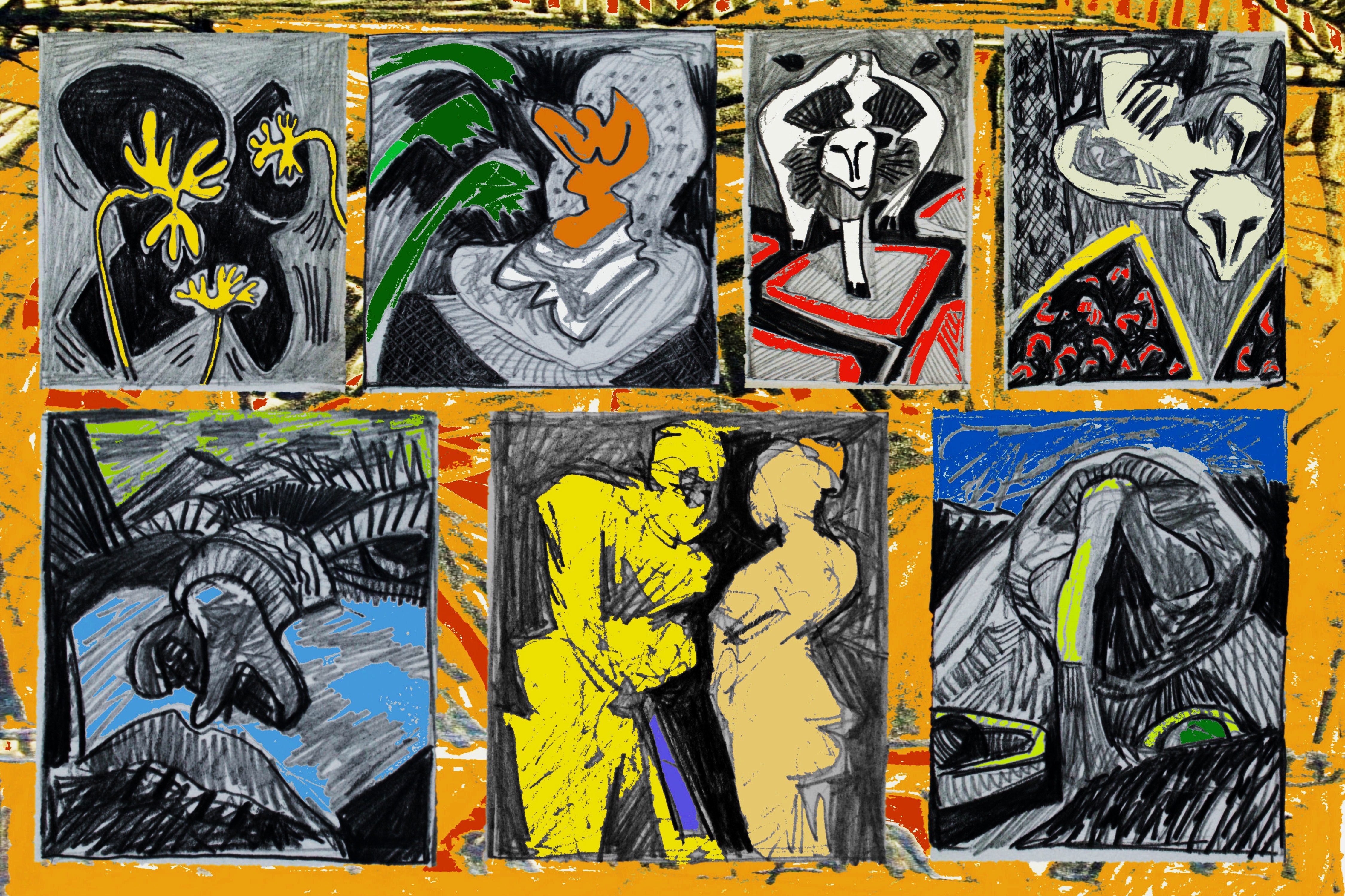 Digitale collage van fragmenten van tekeningen, schilderijen en grafiek gedrukt op 310 grs. Hahnemühle Fine Art papier. Andere formaten mogelijk