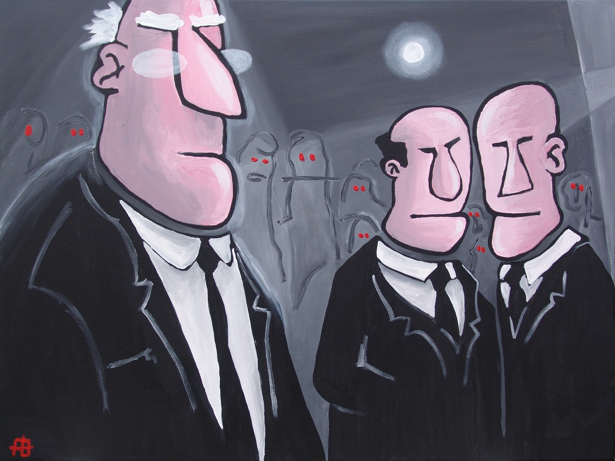 De mannen in zwarte kostuums zien er bijna dreigend uit. Advocaten, notarissen of doodgravers?