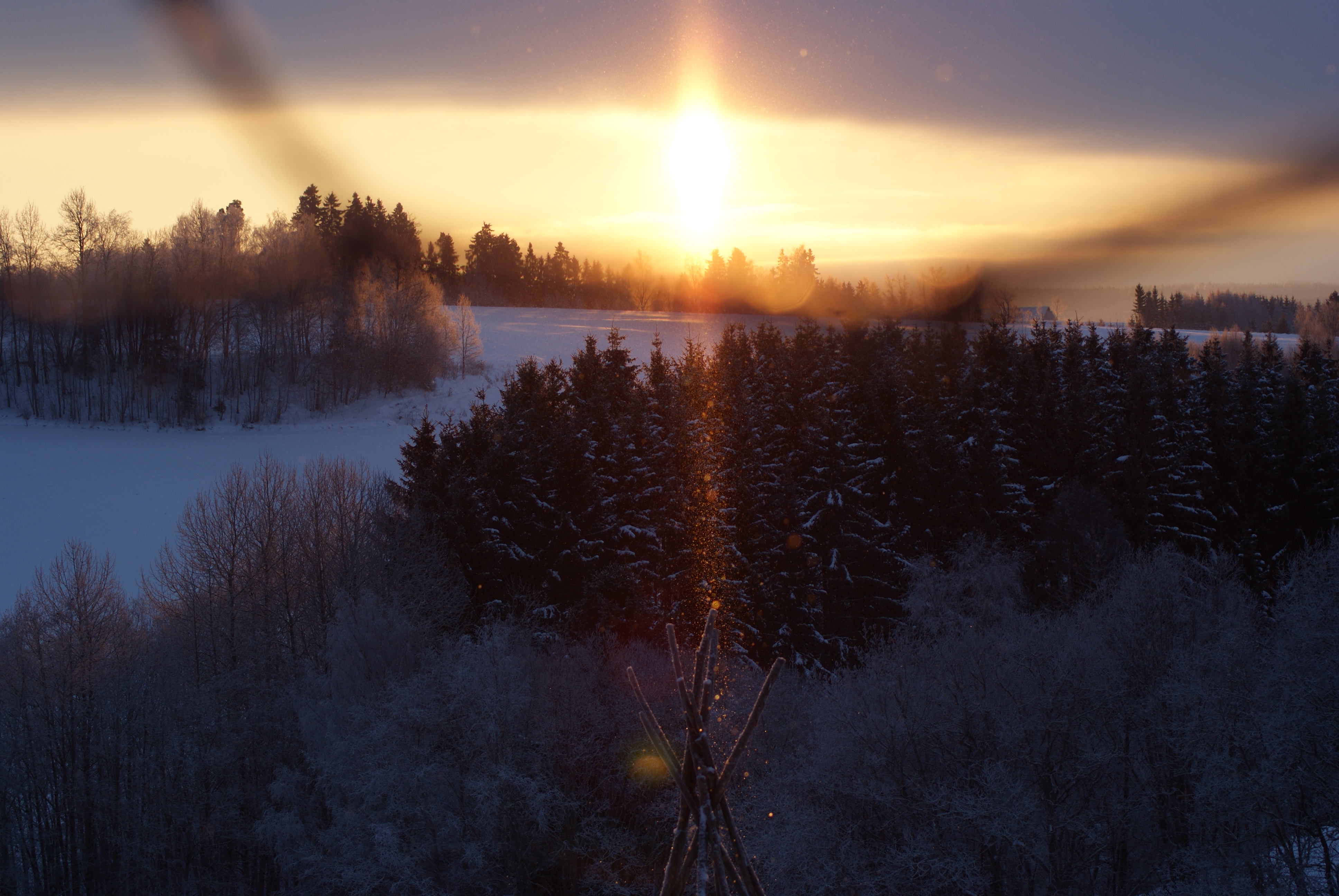 Tussen de takken van de omringende bomen door, komt de zon langzaam boven de horizon uit, waarbij het licht zich werpt op de laatste paar sneeuwvlokjes die langzaam een weg naar beneden zoeken.