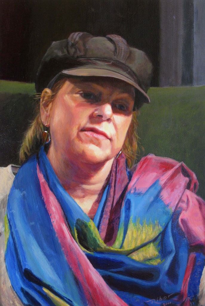 Meditatief Vrouw Portret Stoel Kleurrijk Kop Sjaal Hoofd Pet Oorbel Vrede Mijmeren Vrouwenportret Overweg Hetty Mijmerij Sjalom