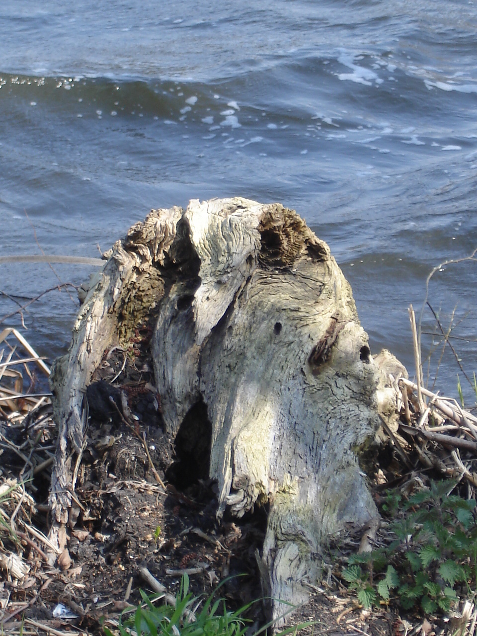 Oude stronk met in de tekening een roofvogel.