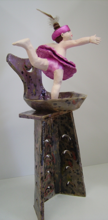 keramiek,gekleurde klei, glazuur, acryl en een veer.
