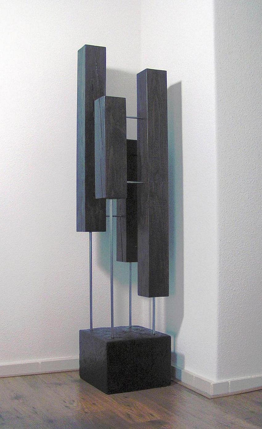 Beeld van eiken hout, roestvast staal en lichtgewicht beton.