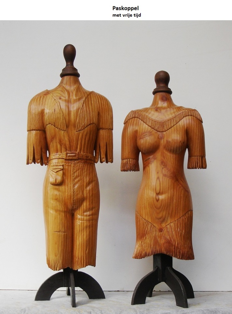 Houten beelden van Djef Blok, surrealistische en vol ironie, soms mild, soms bitter of lieftallig, maar altijd betekenisvol.