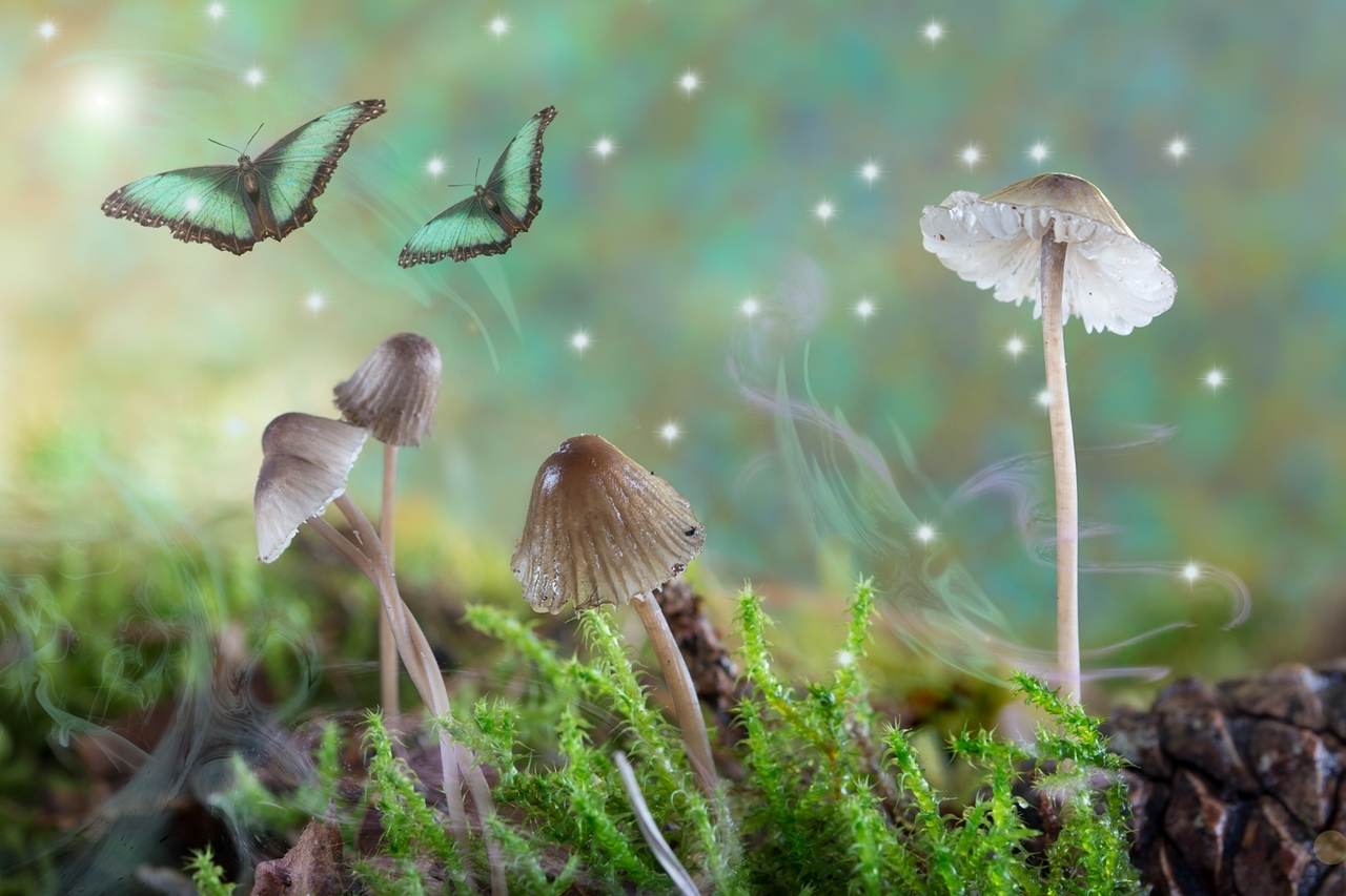 Na het maken van deze foto met paddenstoelen vond ik de sfeer door de achtergrond sprookjesachtig. Dit heb ik versterkt door het toevoegen van vlinders en gekleurde mist. Een sprookjesachtig, fantasierijk, dromerig resultaat. Print te koop via kokandkok.werkaandemuur.nl