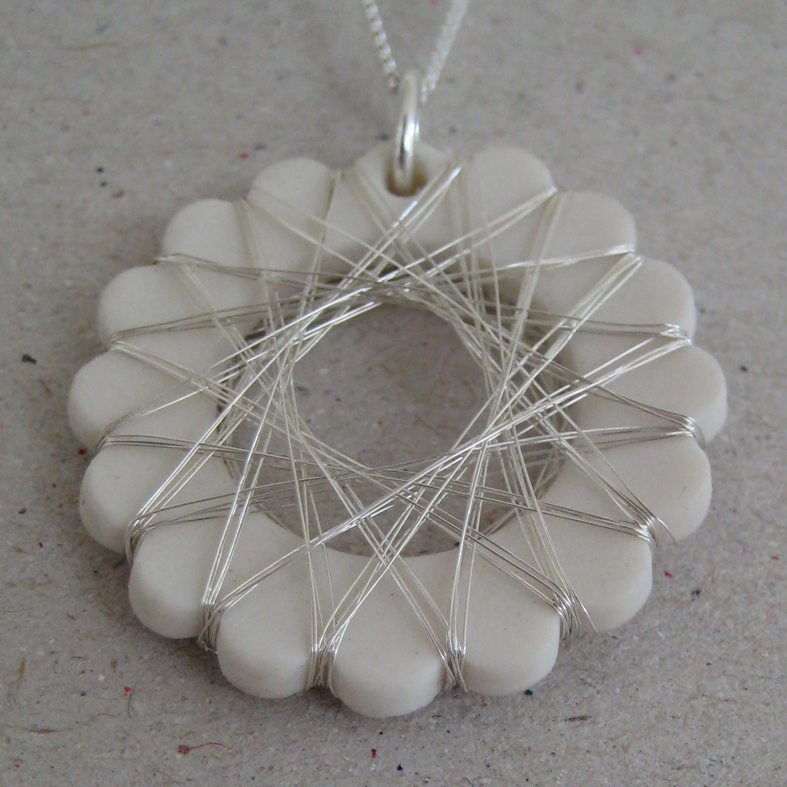 Porselein hanger, een combinatie van natuur (bloem) en geometrie die samen een geheel vormen. materialen: porselein en zilver.