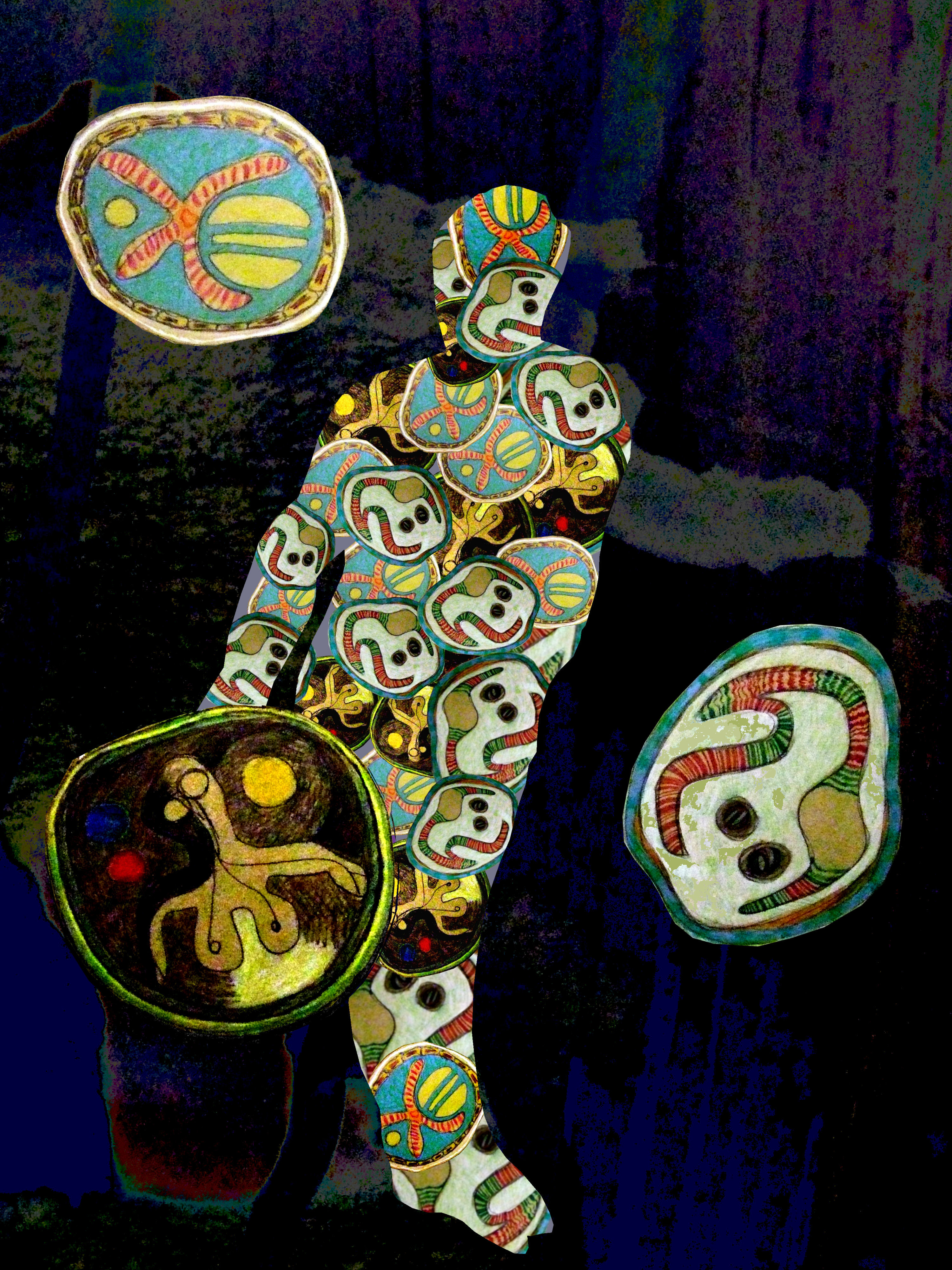 Digigrafiek: Digitale collage van elementen uit eerder gemaakte tekeningen en schilderijen, gedrukt op Hahnemühle FineArt paper. . Andere formaten mogelijk: bv. beeldformaat 75x50 cm= € 250,-- (papierformaat 85x60cm ).)