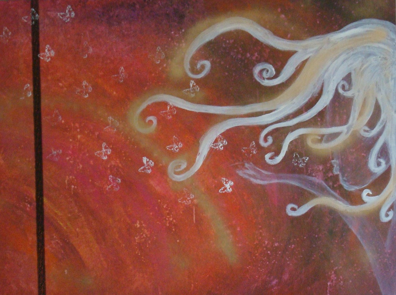 vrouw blaast vlinders de wijde wereld in.