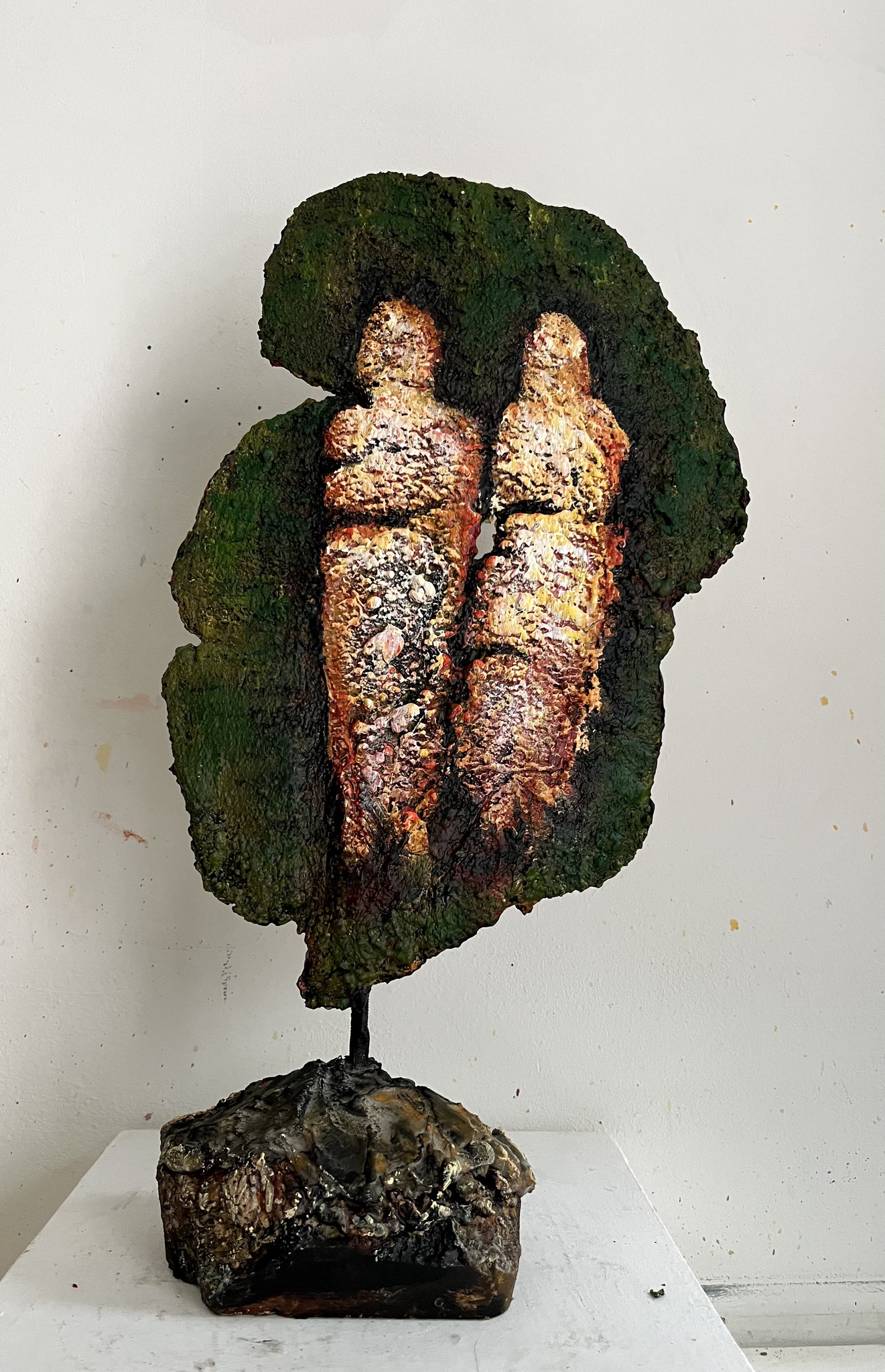 is de andere kant van het beeld ..een Gevoel Van samen-Zijn geinspireerd door alle schoonheid in de natuur...nieuwe lente..groei...bloei... het beeld kan geplaatst worden een voetstukje wat ruimte kan geven aan as van een dierbare overledene... en tevens kan het gebruikt worden als een BEELD waarin (andere) herinneringen in bewaard kunnen worden... een HERINNERINGSBEELD.. ( op deze speciale console € 350)