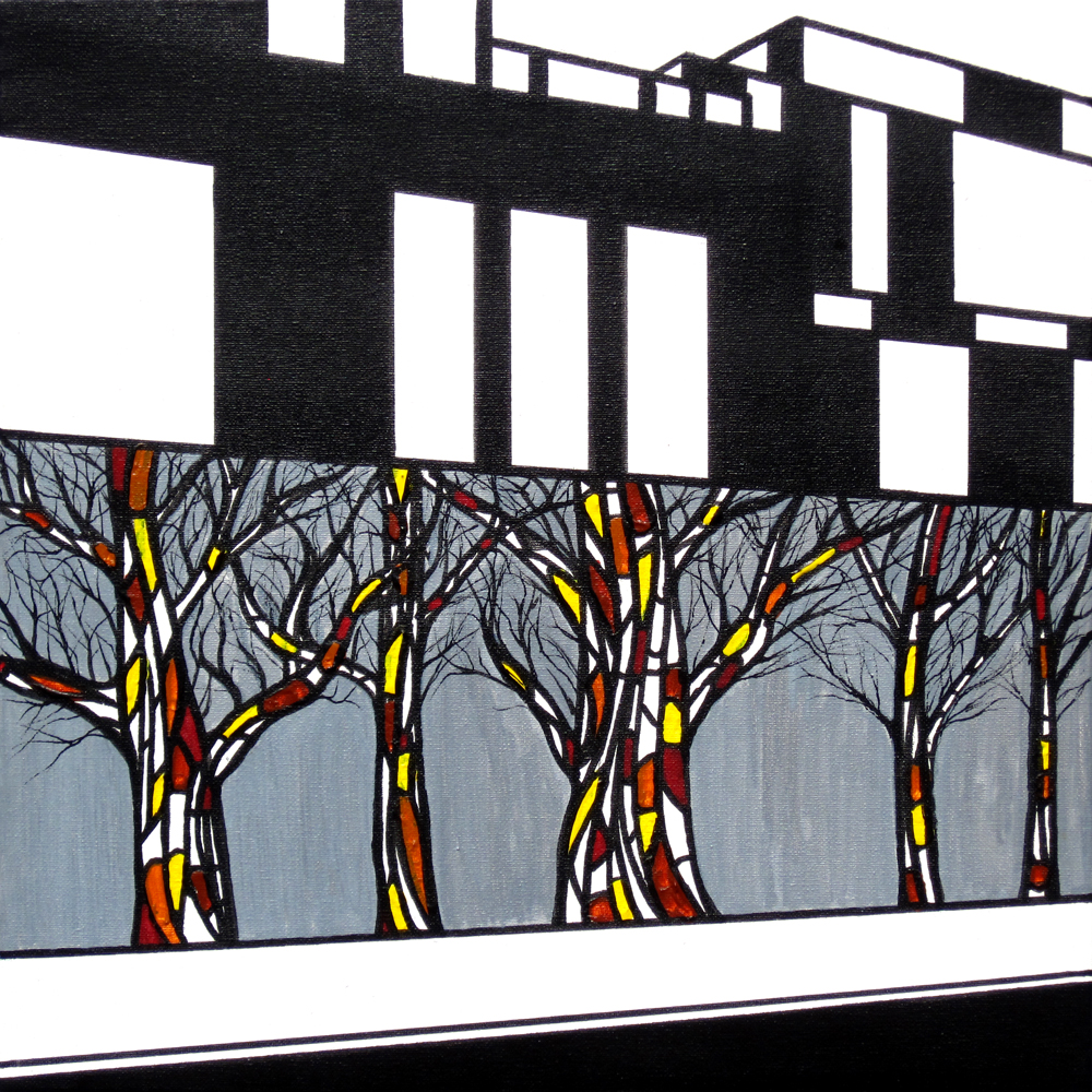Wit Zwart Acryl Bomen Boom Stad Gebouwen Ramen Muur Muren Steden Skyline