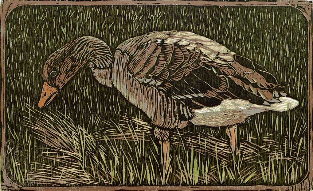 Grauwe gans. Houtsnede, meerkleurendruk. Reductietechniek. Oplage 8 stuks