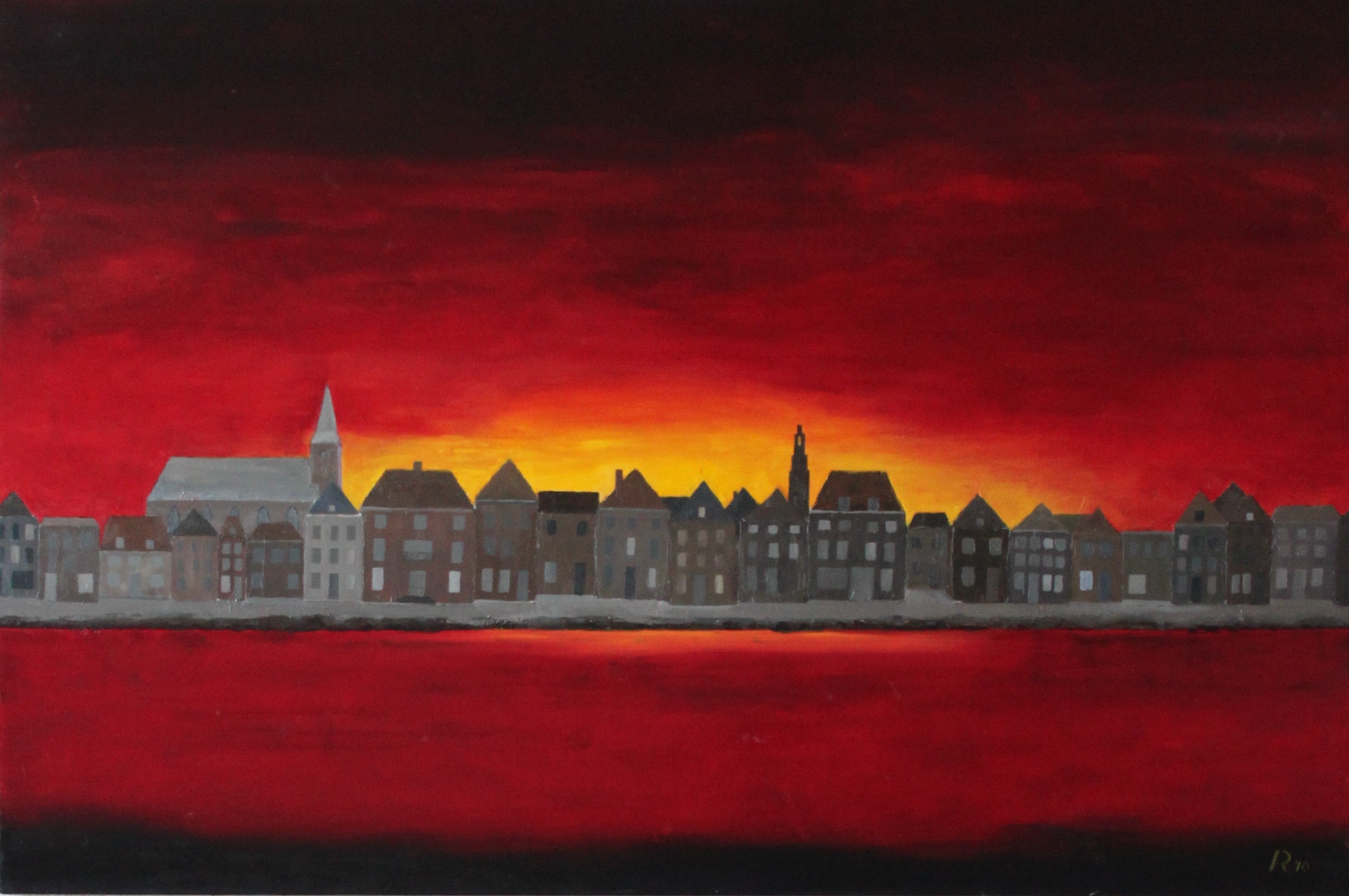 Gezicht op Kampen over de Ijssel, bij zonsondergang.