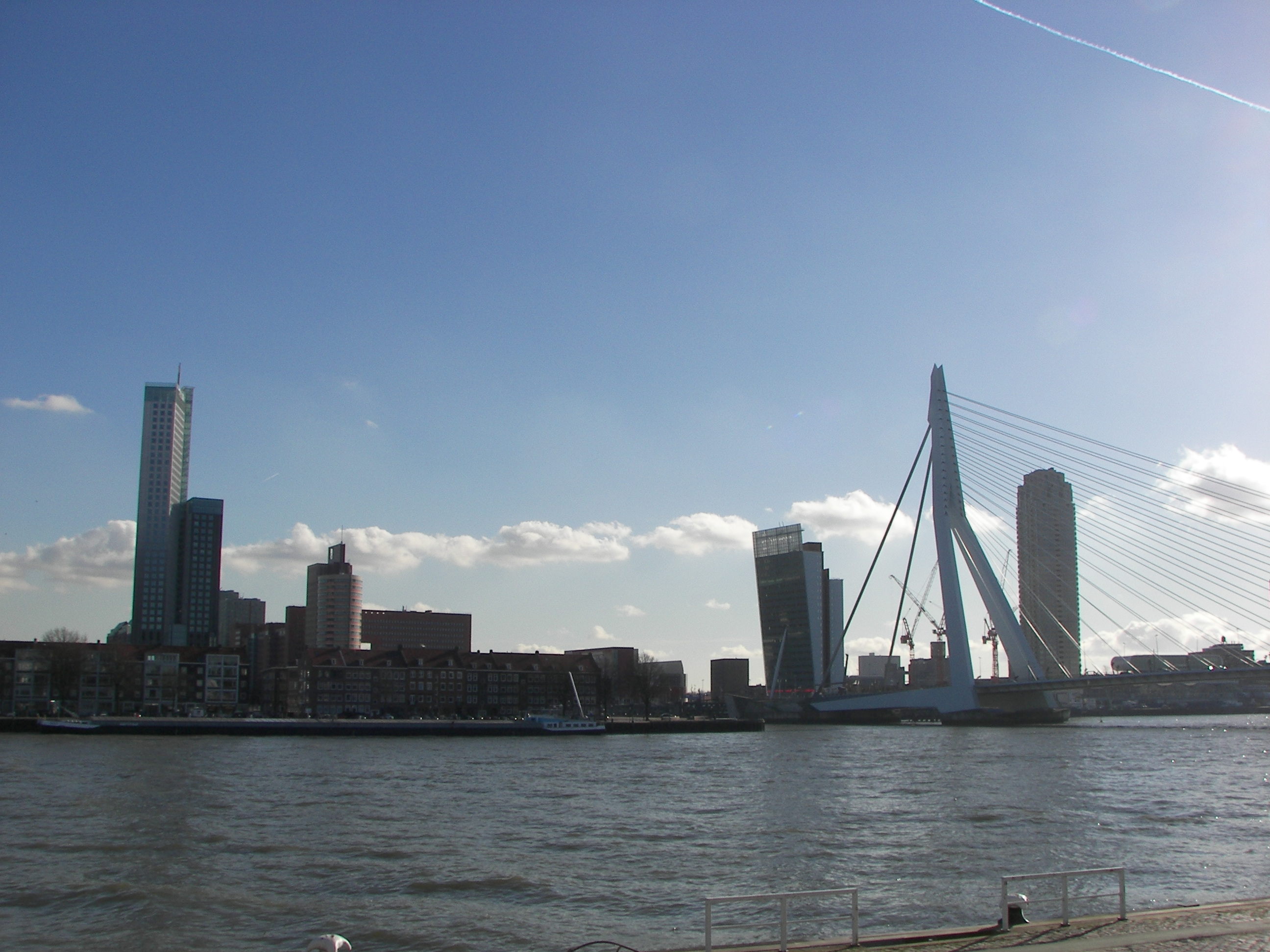 Deze foto neemt je mee om over het water te kijken naar de skyline van Rotterdam.